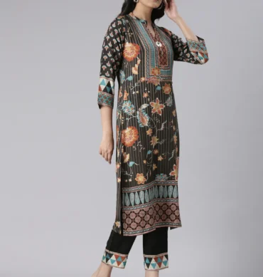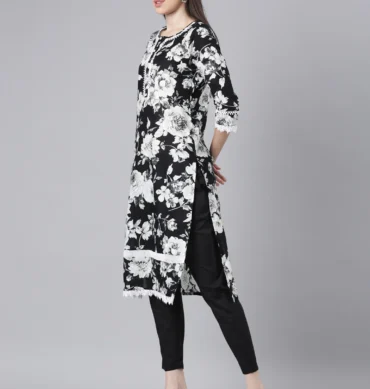 Aentic Women’s Black Floral Printed Kurta Pant & Dupatta Set – Elegant Ethnic Wear