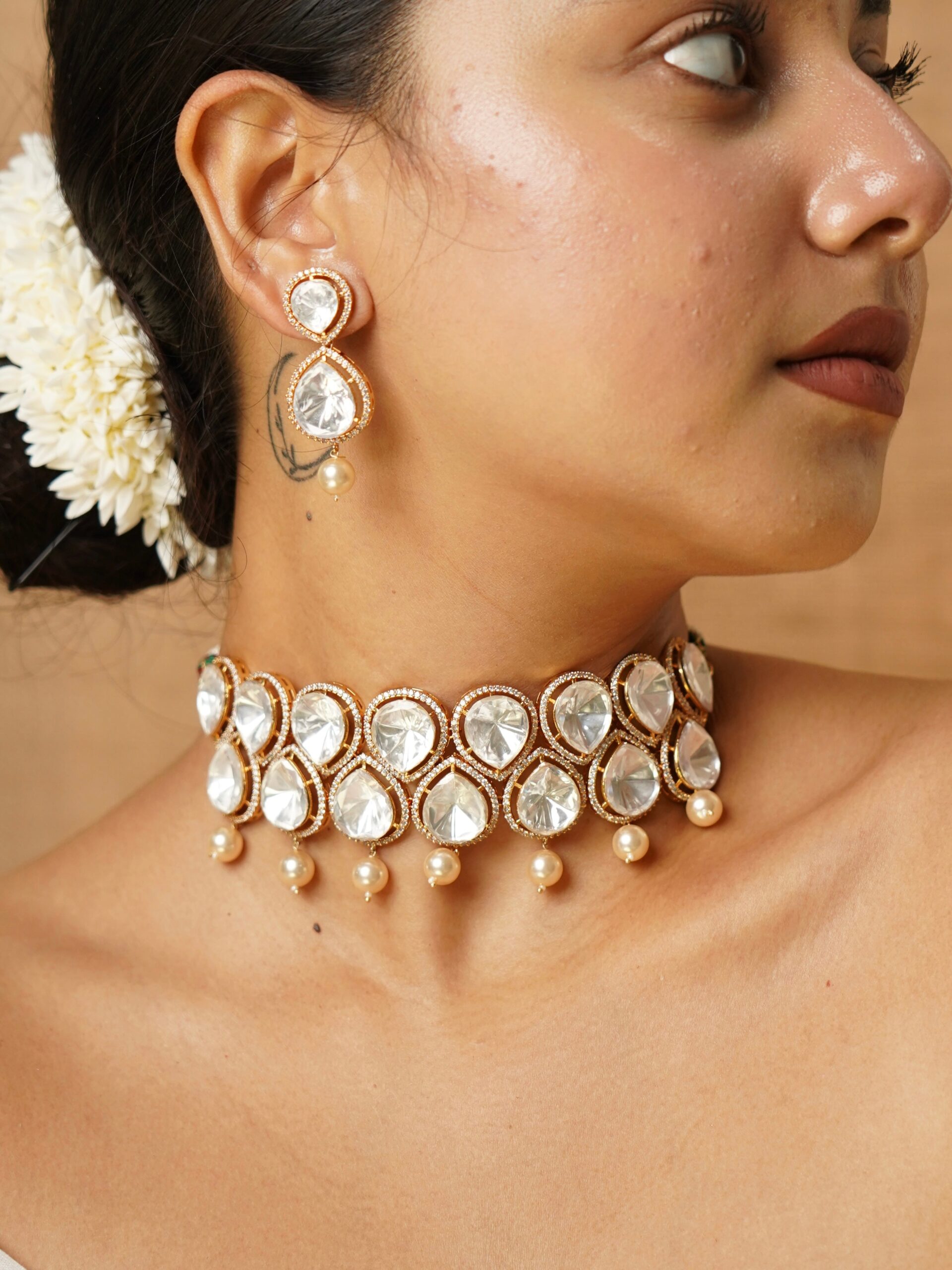 Elevate your celebration style with the Aabroo Polki Pearl Choker Set ? a majestic fusion of traditional Kundan craftsmanship and modern finesse. This luxurious choker features high-polish uncut-style Polki stones in teardrop frames, delicately rimmed with zirconia accents and finished with graceful pearl danglers. Paired with matching earrings, the set is crafted on a premium gold-plated base for enduring brilliance.