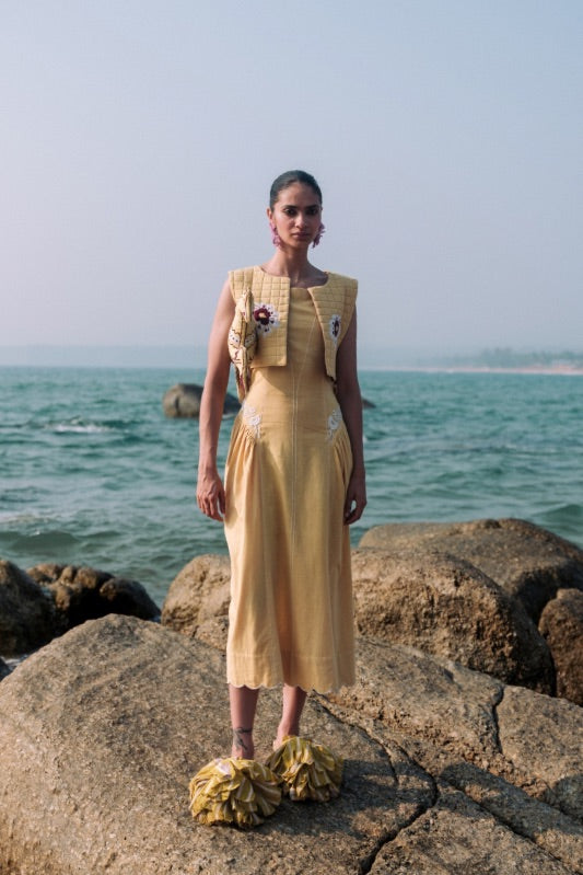 Crafted from hand-dyed, block-printed cotton, this sleeveless square-neck dress features a structured gather at the hip cut accented with delicate embroidery. The design is finished with contrast stitching along the panels.