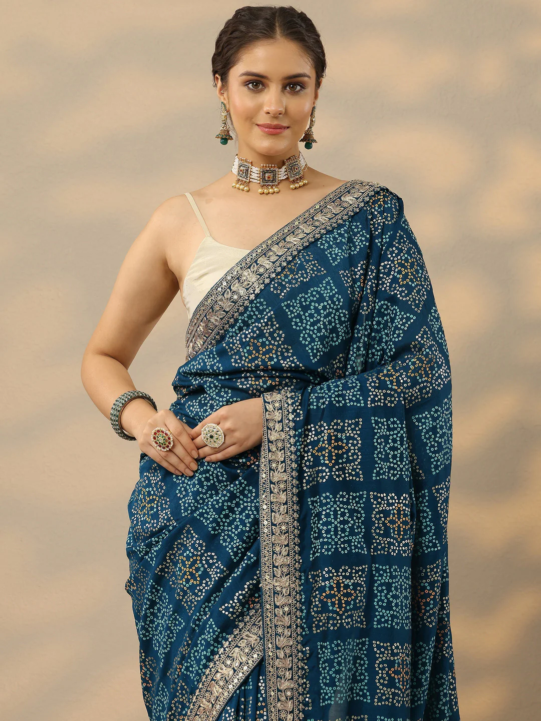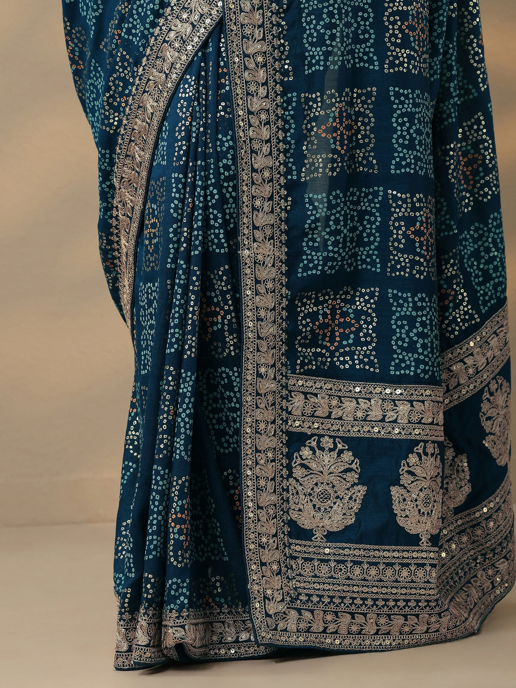 Add a touch of traditional charm to your wardrobe with this blue Bandhani printed silk blend saree from Aentic. Crafted from a soft and lustrous silk blend fabric, this saree features the iconic Bandhani print, known for its timeless patterns and vibrant appeal.
