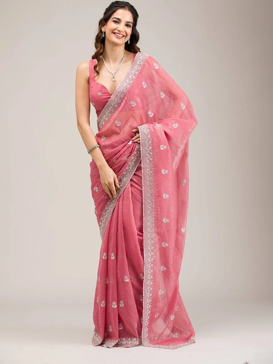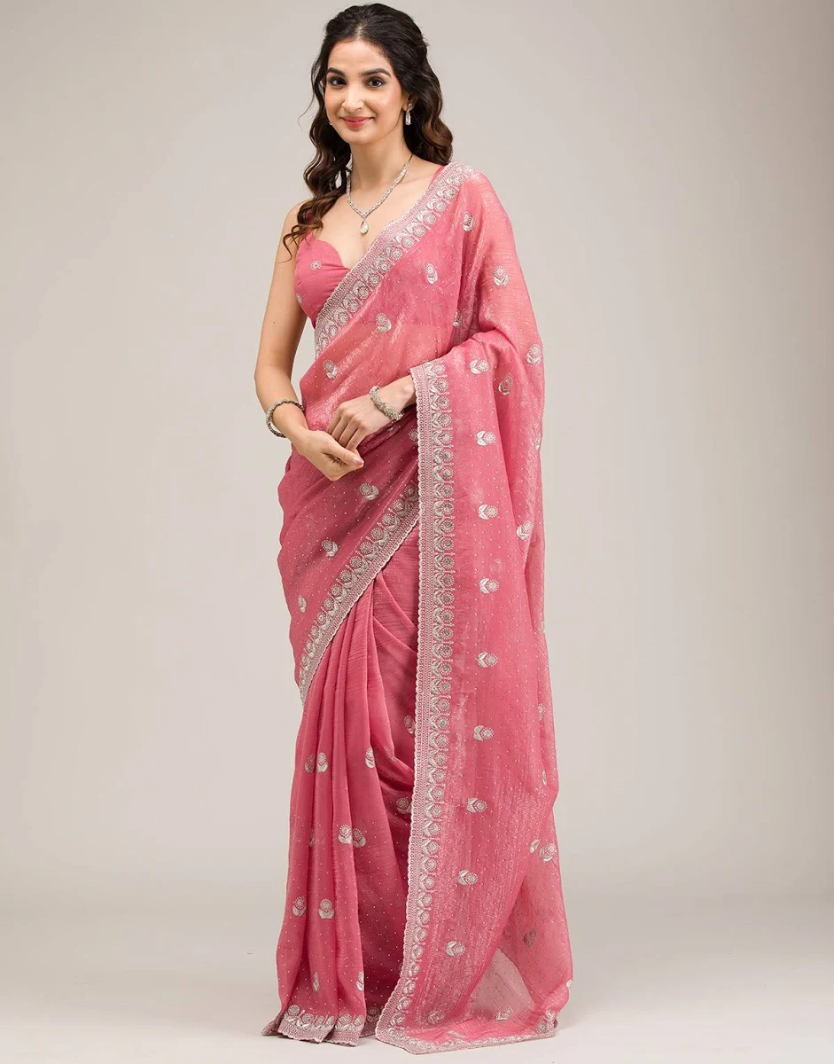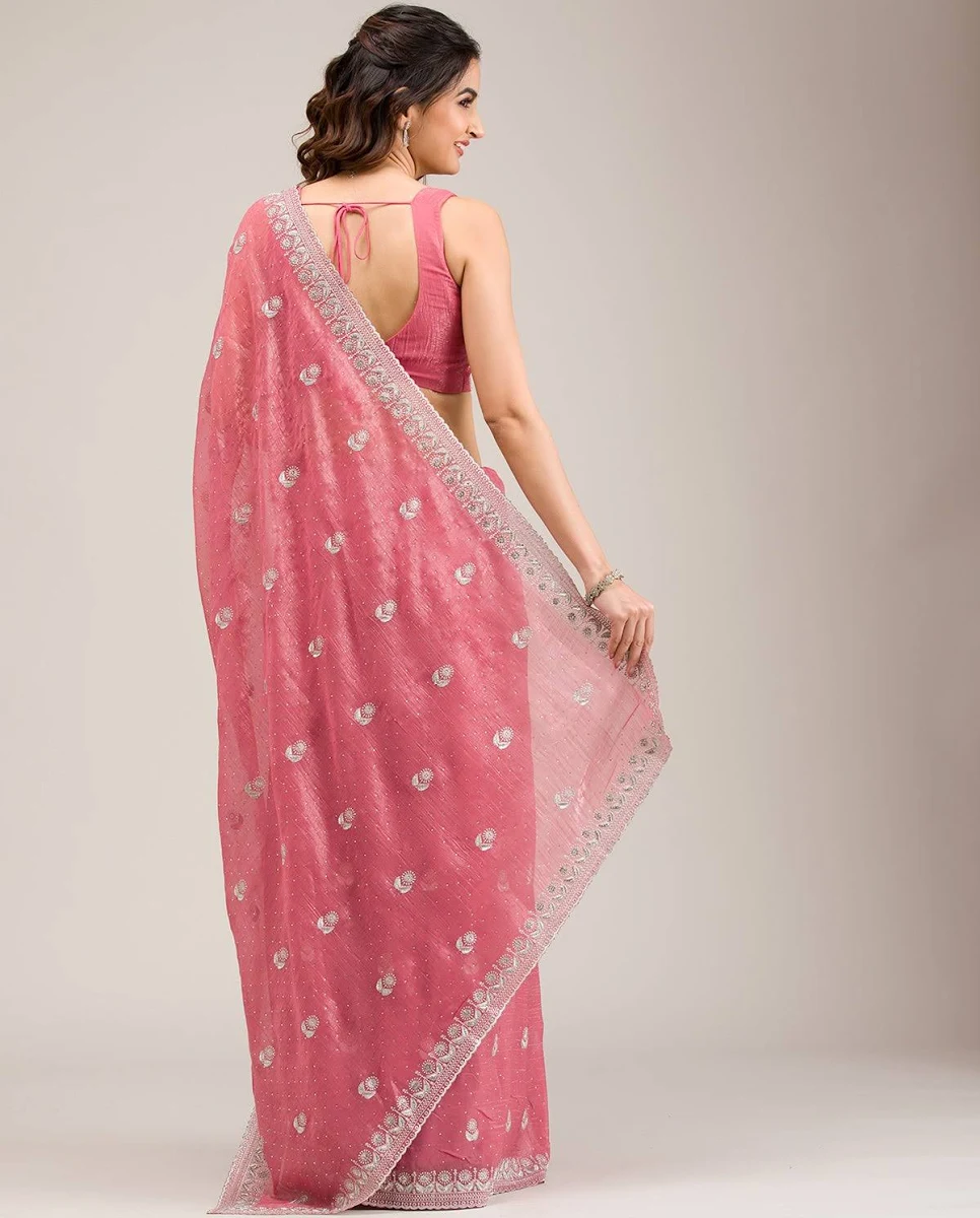 Bring elegance and charm to your ethnic wardrobe with the Aentic Elegant Pink Embroidered Party Wear Saree. This saree features a soft pink shade with delicate embroidered motifs spread across the fabric, giving it a classy and sophisticated appearance.