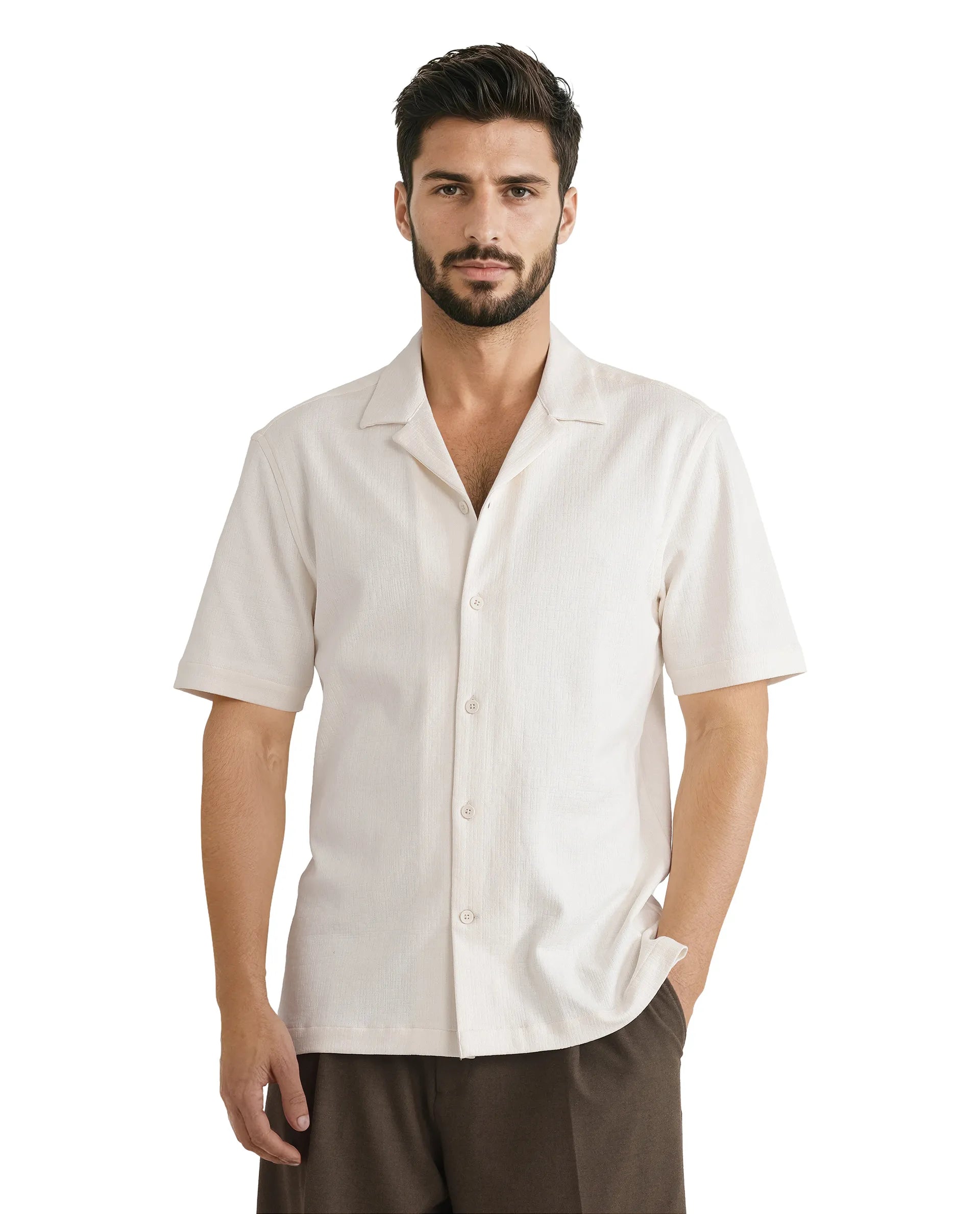 Aentic Men’s Kelos Ss Off White Cotton Blend Plain Boxy Fit Half Sleeve Cuban Collar Shirt