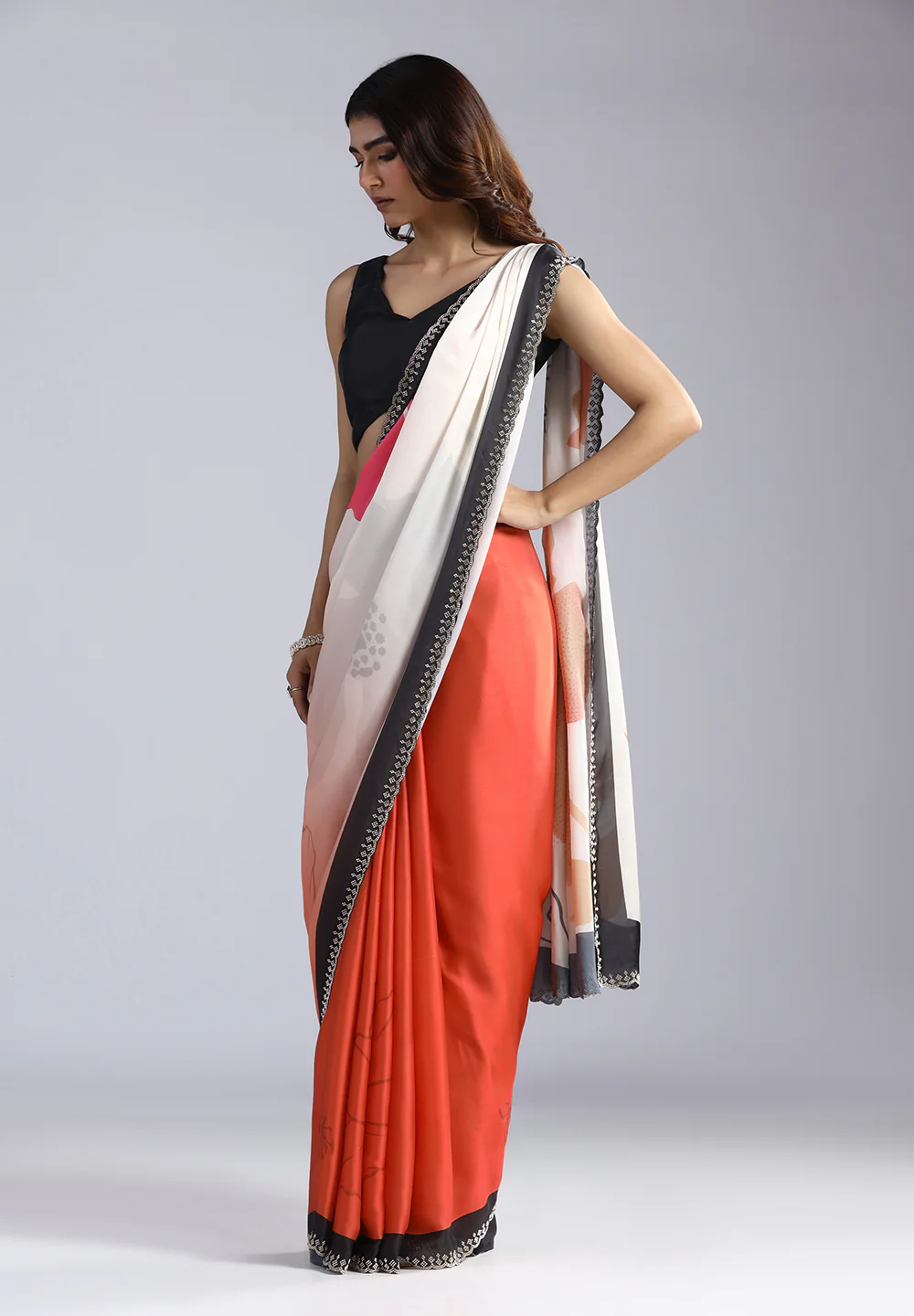 The classic black and ivory palette adds a sophisticated contrast, making it perfect for evening events, office wear, or contemporary festive styling. Lightweight and easy to drape, it offers a flattering silhouette with effortless grace.