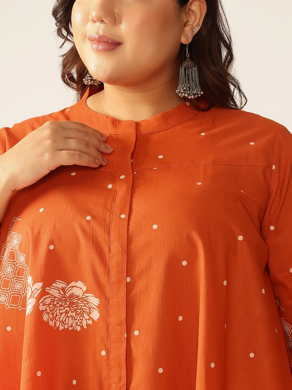 Add a vibrant touch to your wardrobe with this plus-size orange cotton tunic from Aentic. Crafted from breathable pure cotton, this tunic features a beautiful floral print that exudes freshness and charm. The A-line silhouette offers a relaxed, curve-friendly fit that ensures all-day comfort while enhancing your natural shape. Designed with a stylish notch neckline and subtle pleats, it brings a refined elegance to your everyday look. Perfect for casual outings, workwear, or relaxed gatherings, this tunic also includes a convenient side pocket for added functionality.