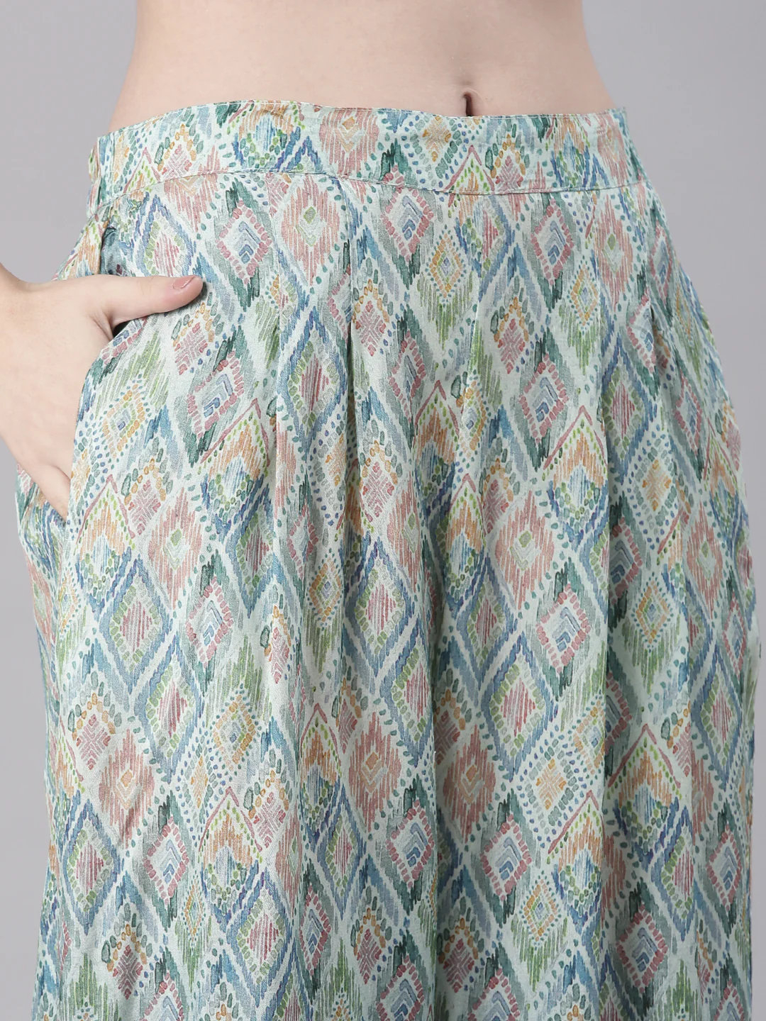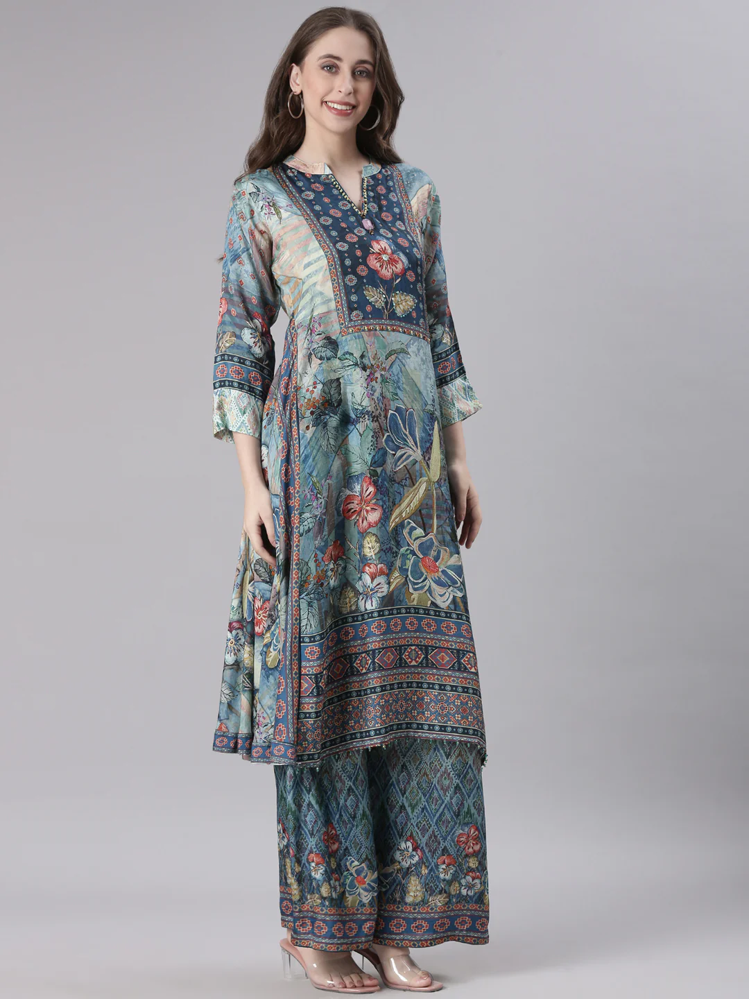 The kurta features an attractive floral print with detailed border patterns that enhance the overall ethnic appeal. Paired with a comfortable matching palazzo, this set offers both style and ease for all-day wear.