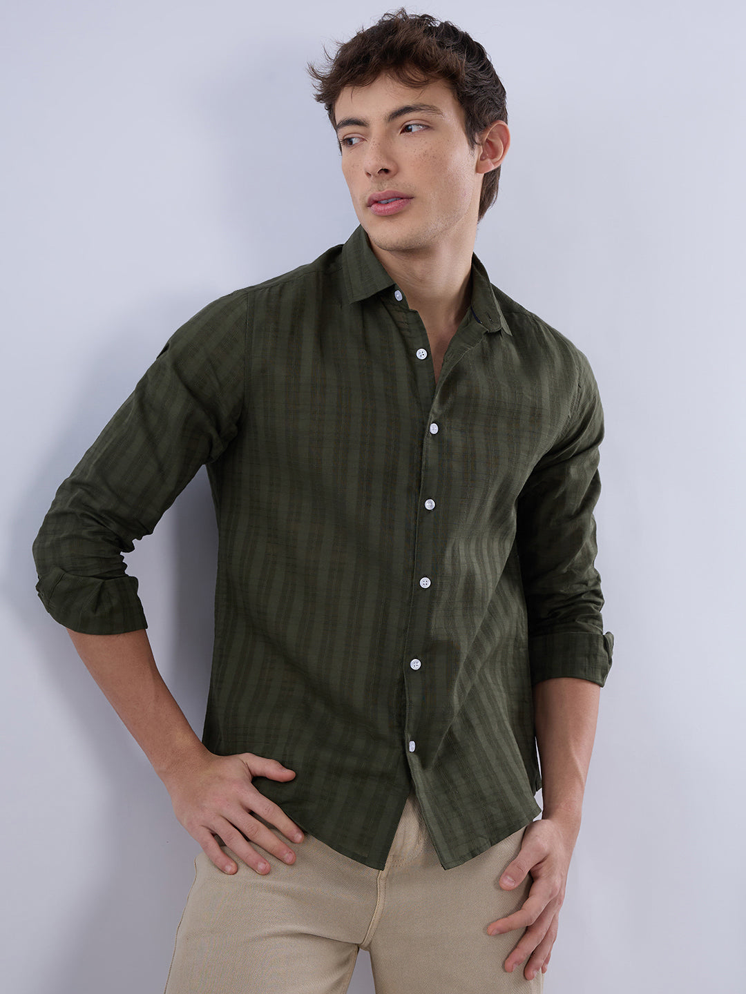 This stylish army green shirt features a subtle Textured striped pattern for texture and visual interest. Designed with a relaxed yet refined fit, it?s perfect for both casual outings and smart-casual occasions. Pair it with our trousers or denim for an elevated everyday look.