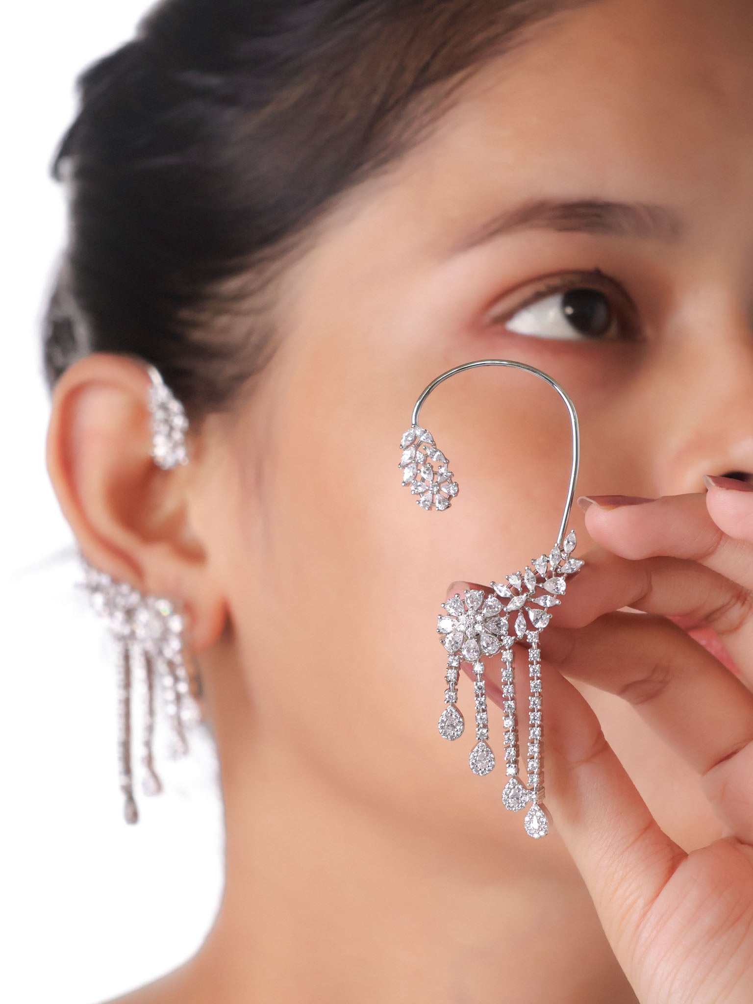 Style it withSlick bun or side-swept hair, silk saris, cocktail gowns, indo-western co-ords. Wear solo or stack with minimalist studs on the other ear for a modern asymmetric look.