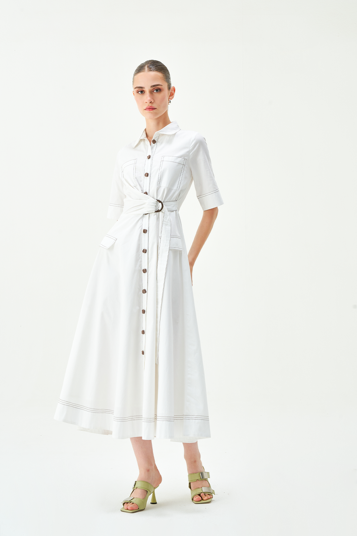 The Camille Belted Midi Dress makes a timeless statement with its flattering silhouette. Designed with a cinched waist and coordinating belt, it combines structure with ease for versatile wear. Style it with neutral-toned heels and a sleek clutch for a refined daytime look.