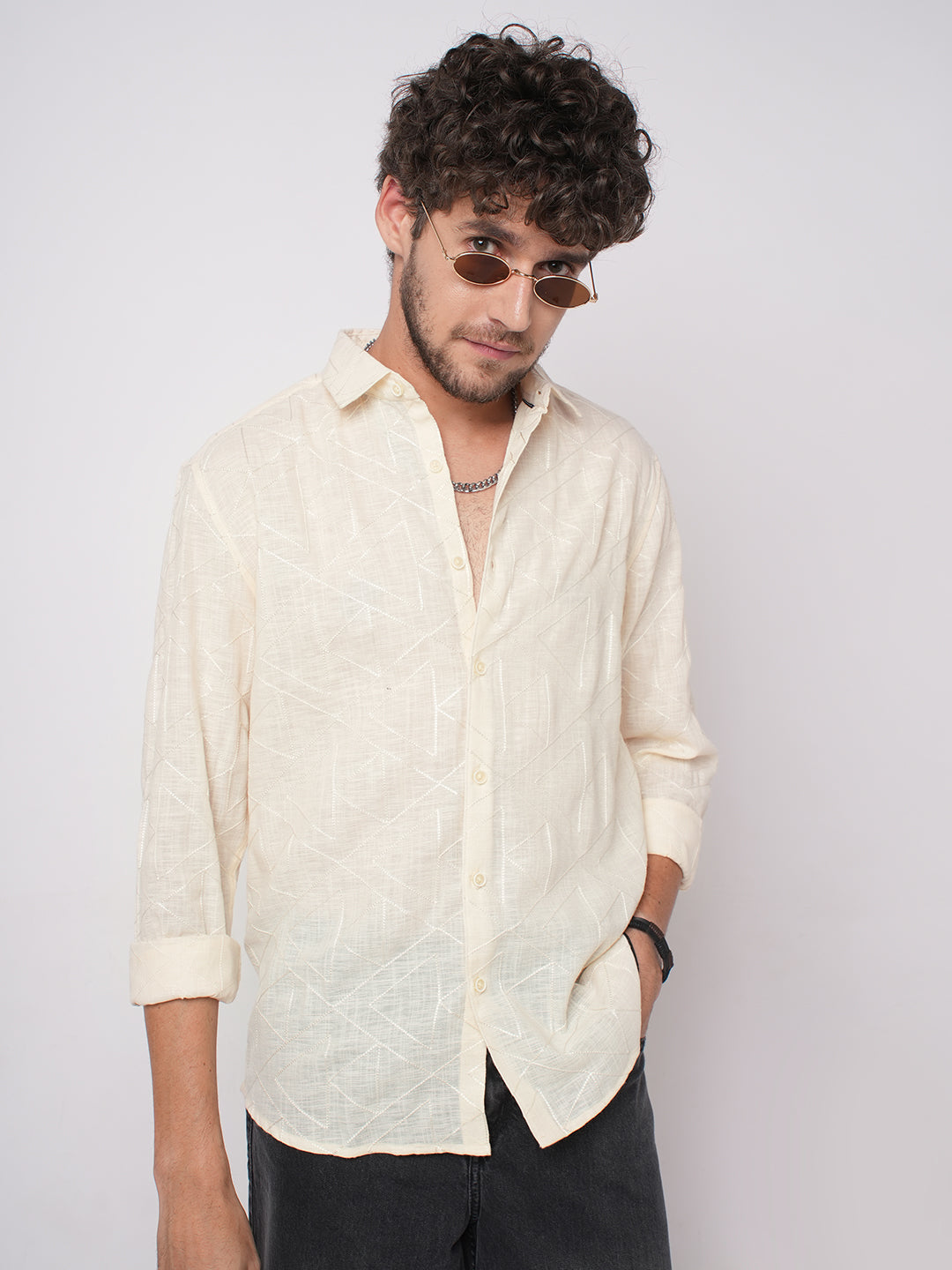 Redefine your everyday style with this Canvas Cream Latticework Shirt. Its crisp cream base is elevated by an intricate lattice-inspired design, blending modern artistry with casual comfort. Perfect for pairing with denim, chinos, or tailored pants, this shirt is a statement in versatile fashion.