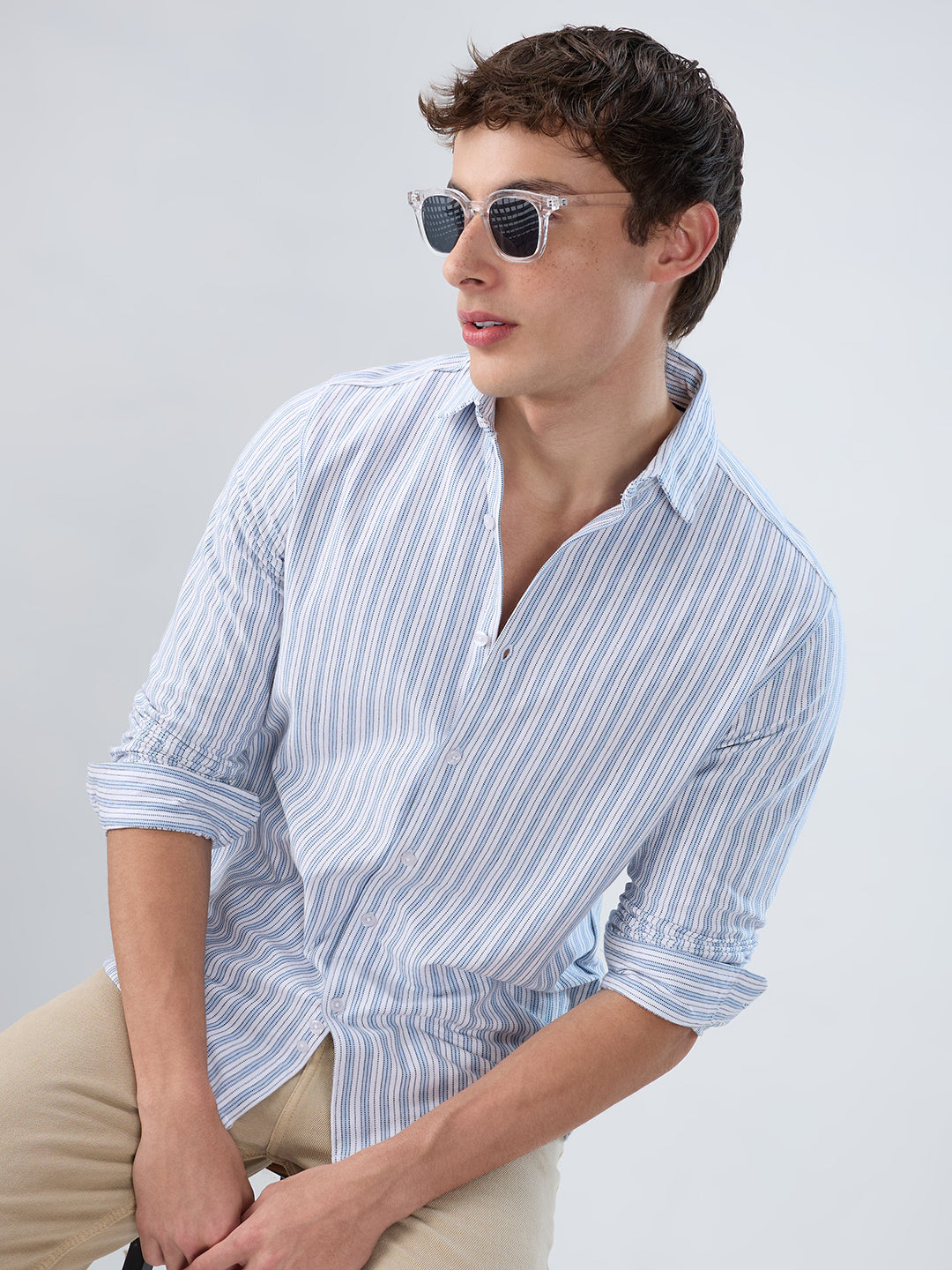 Refresh your wardrobe with the timeless appeal of this Classic Blue Mist Striped Knitted Shirt. Featuring soothing blue tones and subtle vertical stripes, this shirt brings a clean, refined aesthetic to any look. Crafted from a soft, breathable fabric, it ensures comfort throughout the day while maintaining a polished silhouette. Perfect for both work and weekend wear, it?s a versatile essential that pairs effortlessly with our trousers.