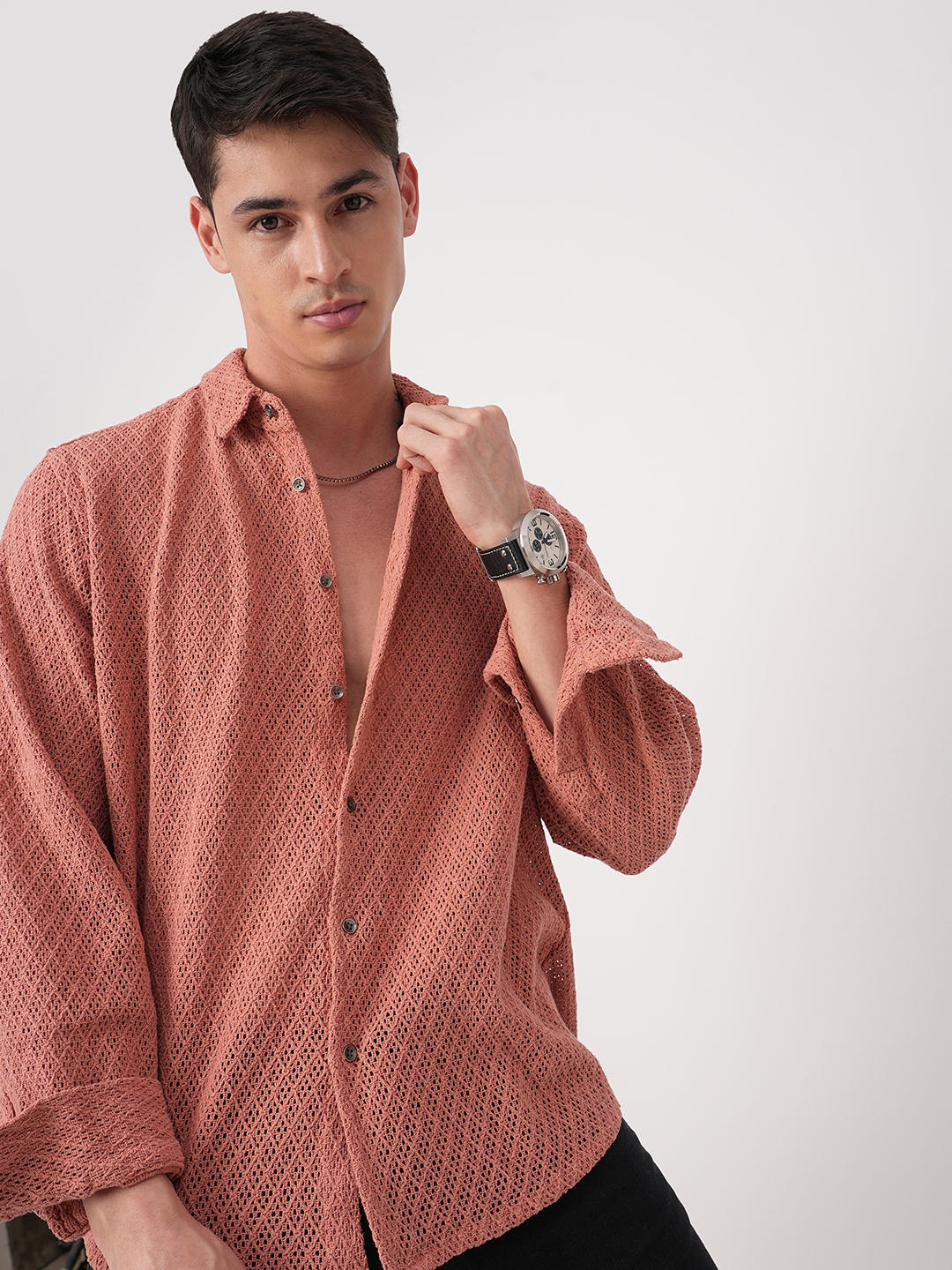Add a pop of colour to your casual wardrobe with our Classic Coral Crochet Cropped Shirt. Featuring full sleeves and airy texture, it?s a go-to for relaxed days. Pair with denim shorts or light chinos and slip-on sneakers for an effortlessly cool vibe!