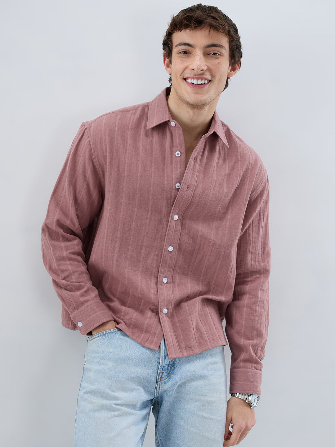 Dusty Peach Double Cloth Seersucker Striped Boxy Fit Crop Shirt