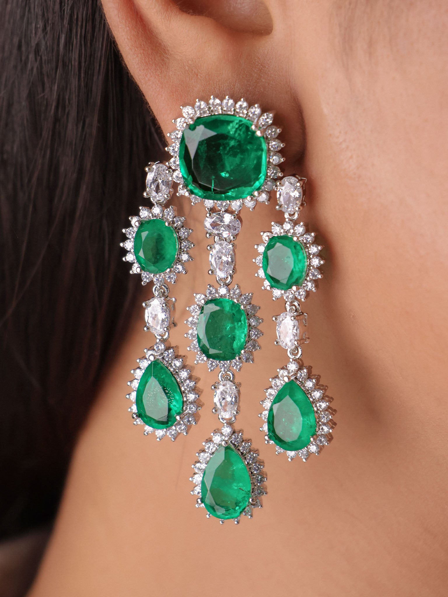 Each tier is meticulously placed to create fluid movement, allowing the earrings to catch light beautifully with every turn. The bold emerald hue adds a regal richness, making these earrings an instant showstopper for evenings, weddings, cocktail events, and luxury celebrations.