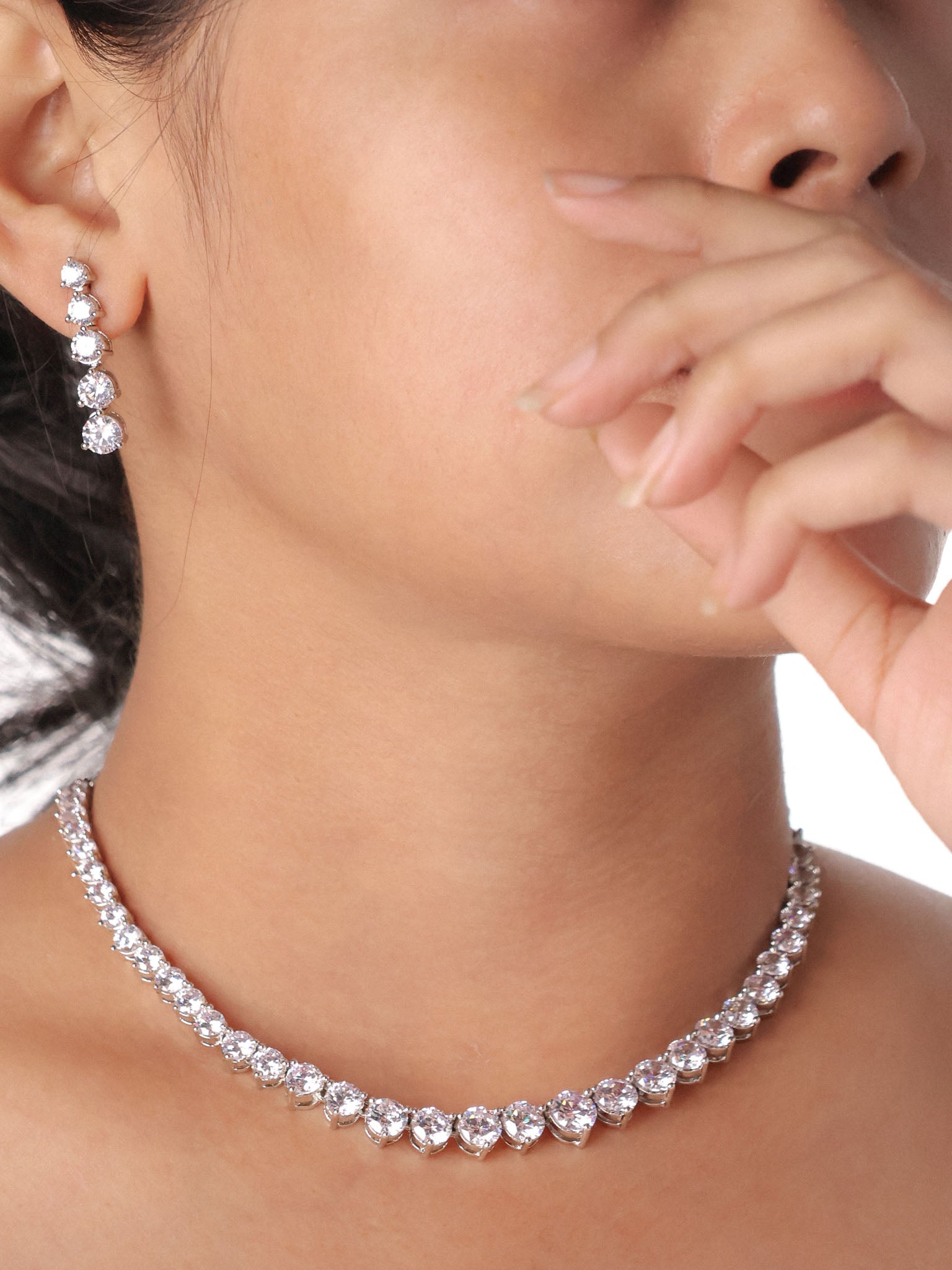 Inclusions: Necklace + EarringsPlating: Premium Rhodium FinishStone: AAA+ Cubic ZirconiaOccasion: Party | Cocktail | Everyday | Weddings