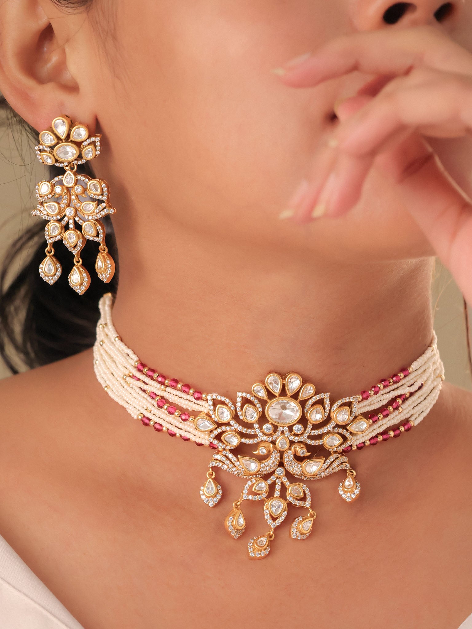 A floral burst of kundan-set polki sits at the centre of multi-row ivory seed pearls threaded with rose-pink beads. The choker is finished with teardrop danglers for fluid sparkle and paired with cascading chand earrings?perfect for sangeet to reception.