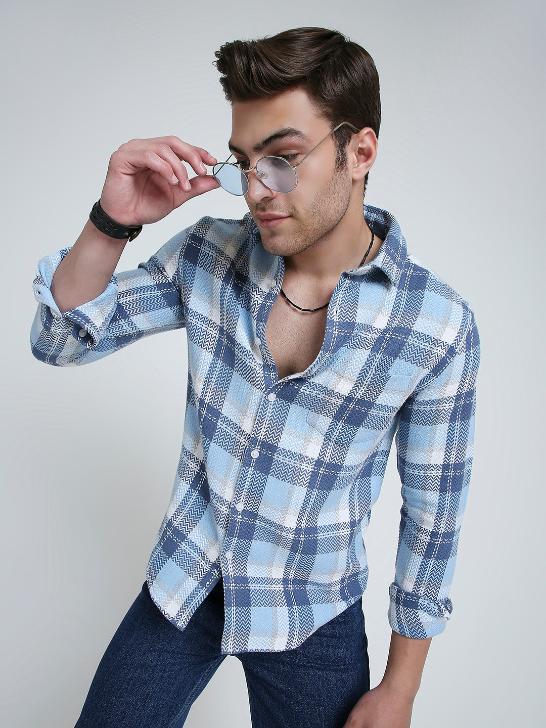 Wrap yourself in winter-ready elegance with this Icy Grid Winter Weave Zig-Zag Plaid Shirt. Crafted in a soft, textured weave, this shirt features a modern take on plaid with a subtle zig-zag pattern in cool icy tones. Designed for warmth without bulk, it offers comfort, structure, and elevated seasonal style, perfect for layering or wearing on its own.
