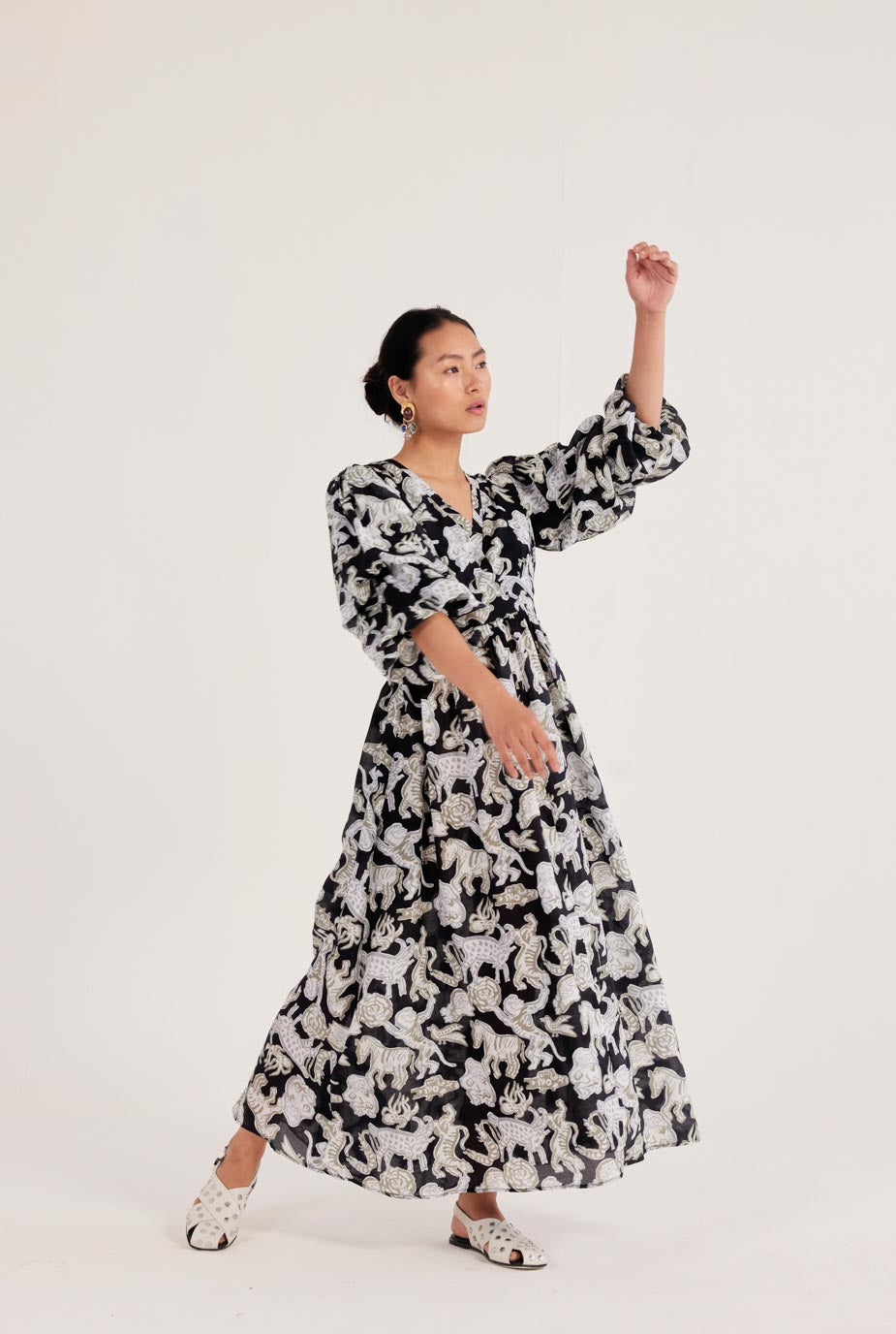 This stand out dress is crafted in bold hand printed animal motifs. This flowy maxi dress has dramatic doubly puffed sleeves and a plunging neckline framed by an empire waistline, ensuring a super flattering fit. Pair it with a headband or wide rimmed sunglasses for the perfect vintage look.