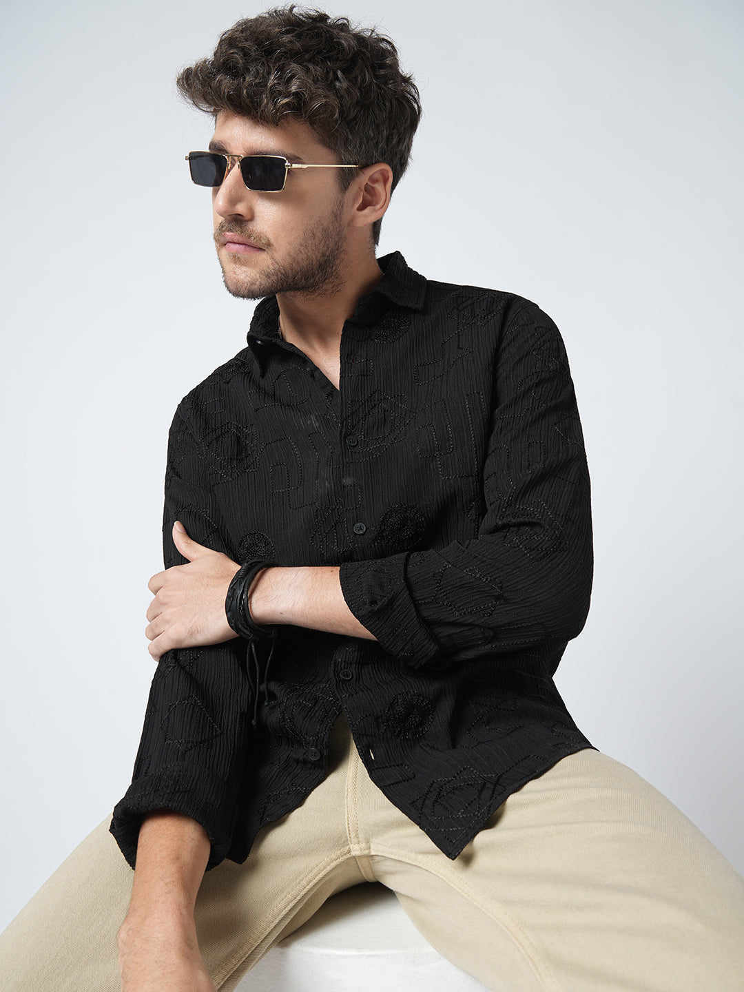 This Intricate Black Embroidered Textured Shirt features a rich crinkled fabric adorned with subtle geometric threadwork that adds depth and character. Designed in deep onyx black, this shirt blends minimalism with artisanal detailing, perfect for evening outings or elevated casual wear. Pair it with tailored trousers or denims for a refined yet contemporary look.