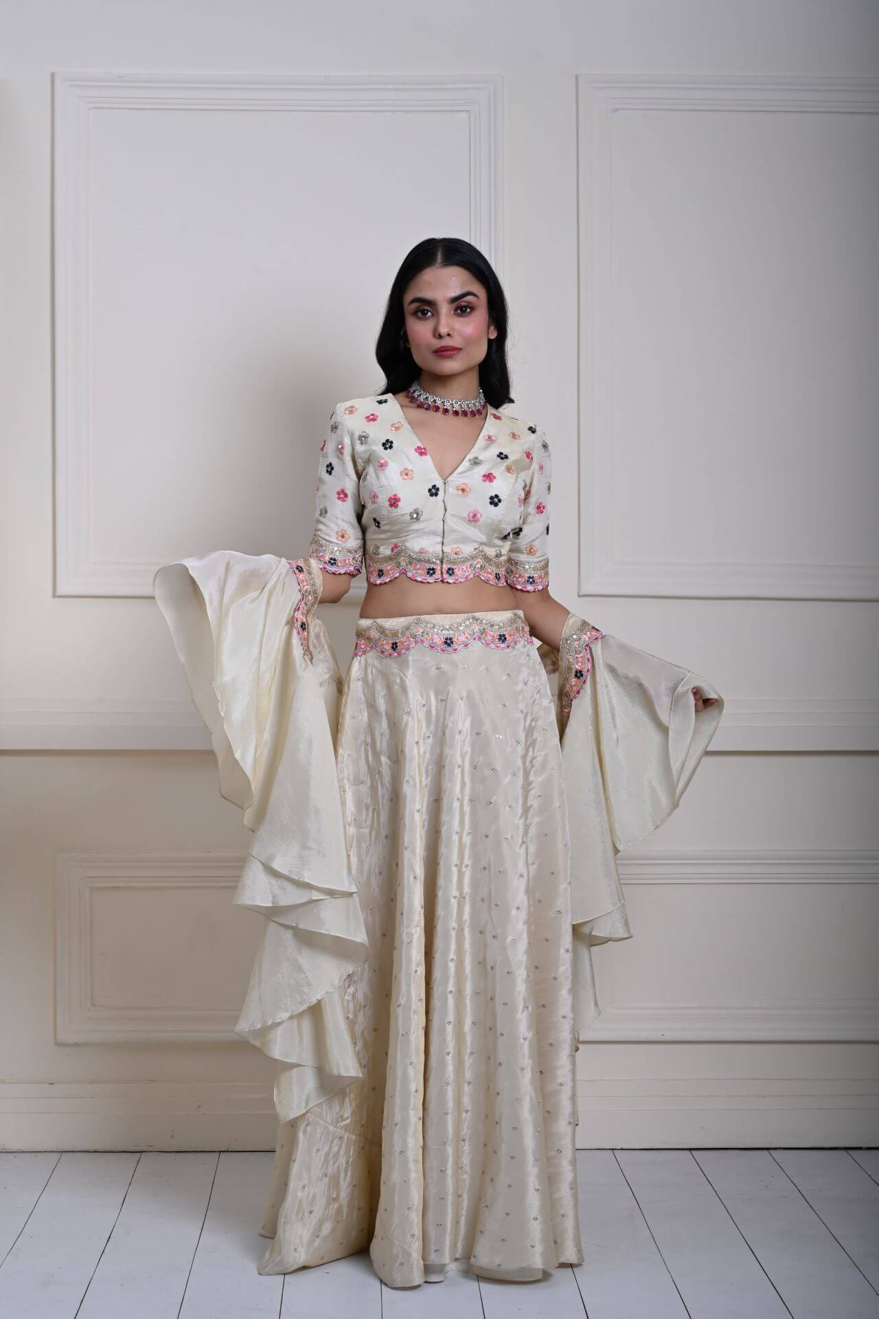 Ivory Tissue Silk Hand Embroidered Lehenga with Ruffle Dupatta