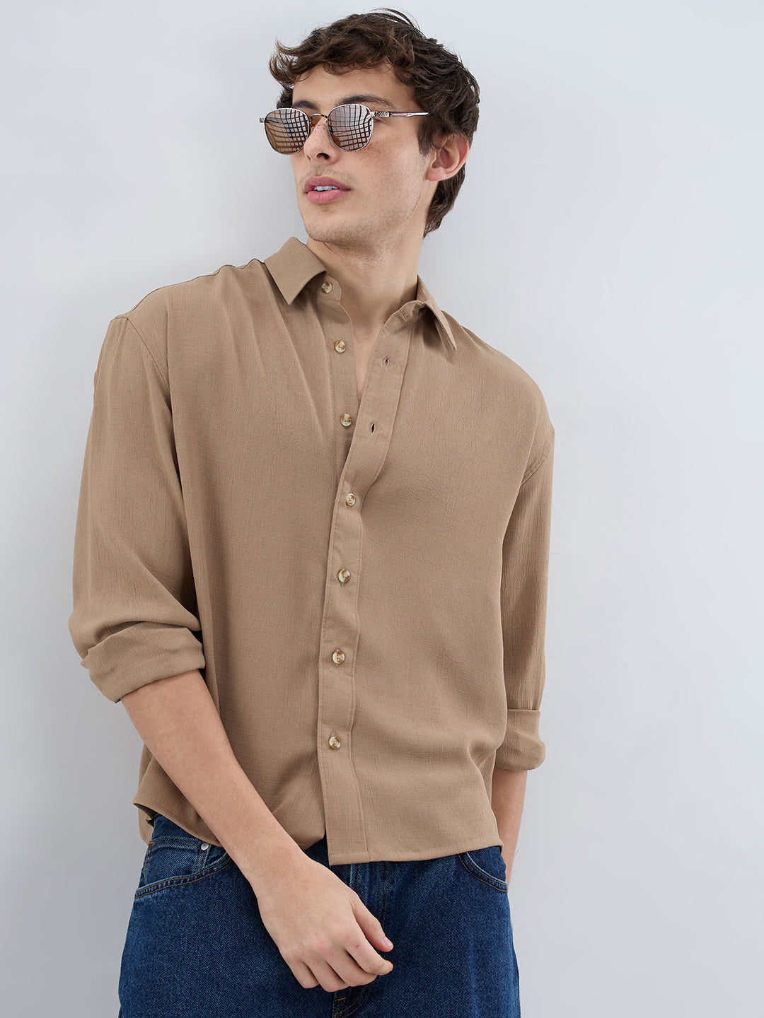 Refresh your wardrobe with this Khaki Olive Fine Grid Textured Boxy Fit Oversized Shirt, designed with a subtle grid pattern for understated detail. The rich khaki olive tone adds depth while maintaining a versatile appeal. Perfect for pairing with our trousers for a smart, everyday look.