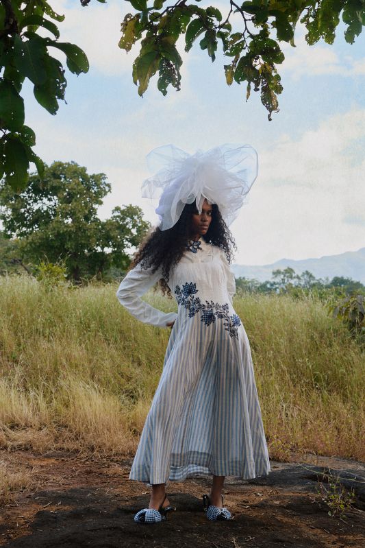 A beautiful sleeveless midi dress combining a white fitted bodice with a full skirt made from a pale blue handwoven stripe fabric. The bodice is accented with rich navy blue gingham check applique at the waist, creating a flattering contrast of color, texture, and print.?