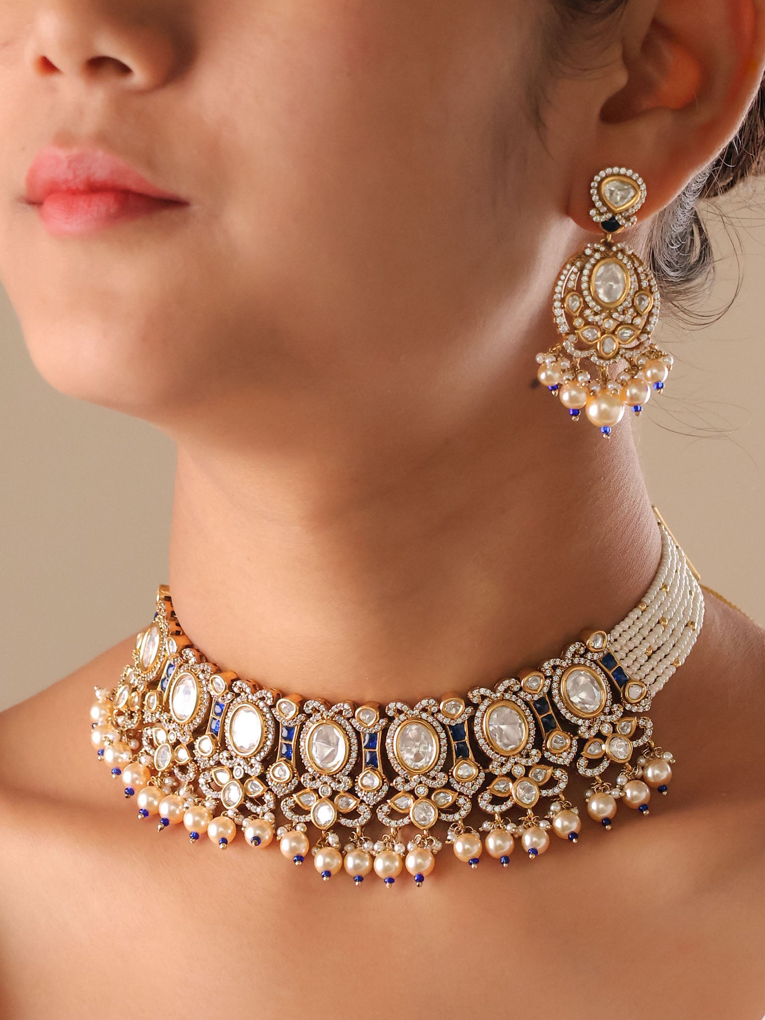 Accented with subtle hints of deep blue detailing, the design draws inspiration from traditional heirloom jewellery worn by queens. The soft layers of pearls add movement and richness, making it a striking choice for weddings and grand festivities.