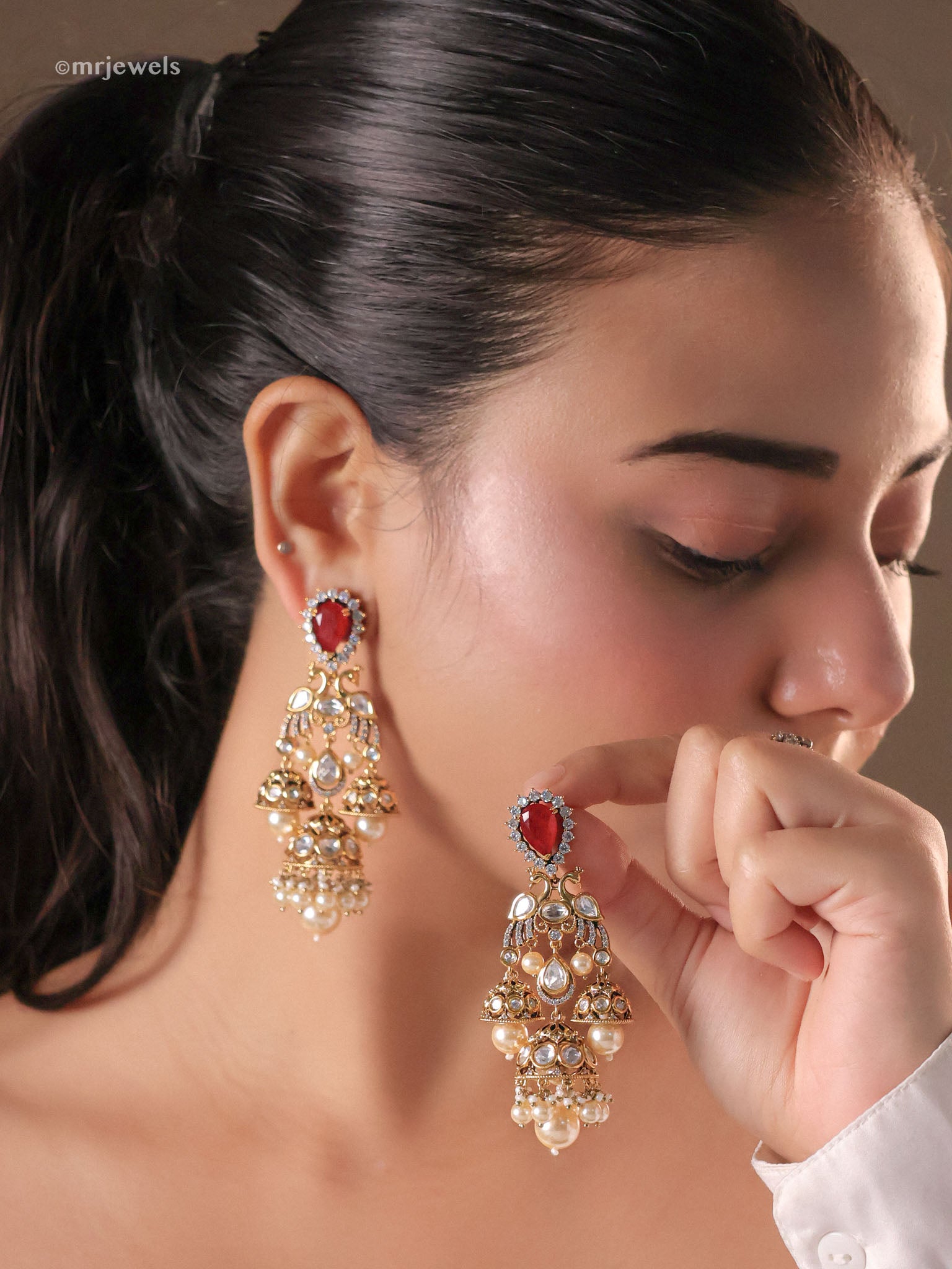 Twin peacocks lead into a lattice of kundan teardrops, finished with two mini domes and a grand jhumka tipped in luxe pearls. A teardrop colour stone at the stud adds a rich pop?dramatic sway, lightweight feel.