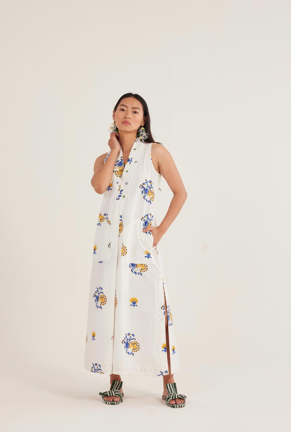 Summer whites for the win! A-line dress with box pleat in the front, v-neck and pleats on the side. Handblock printed in cotton.