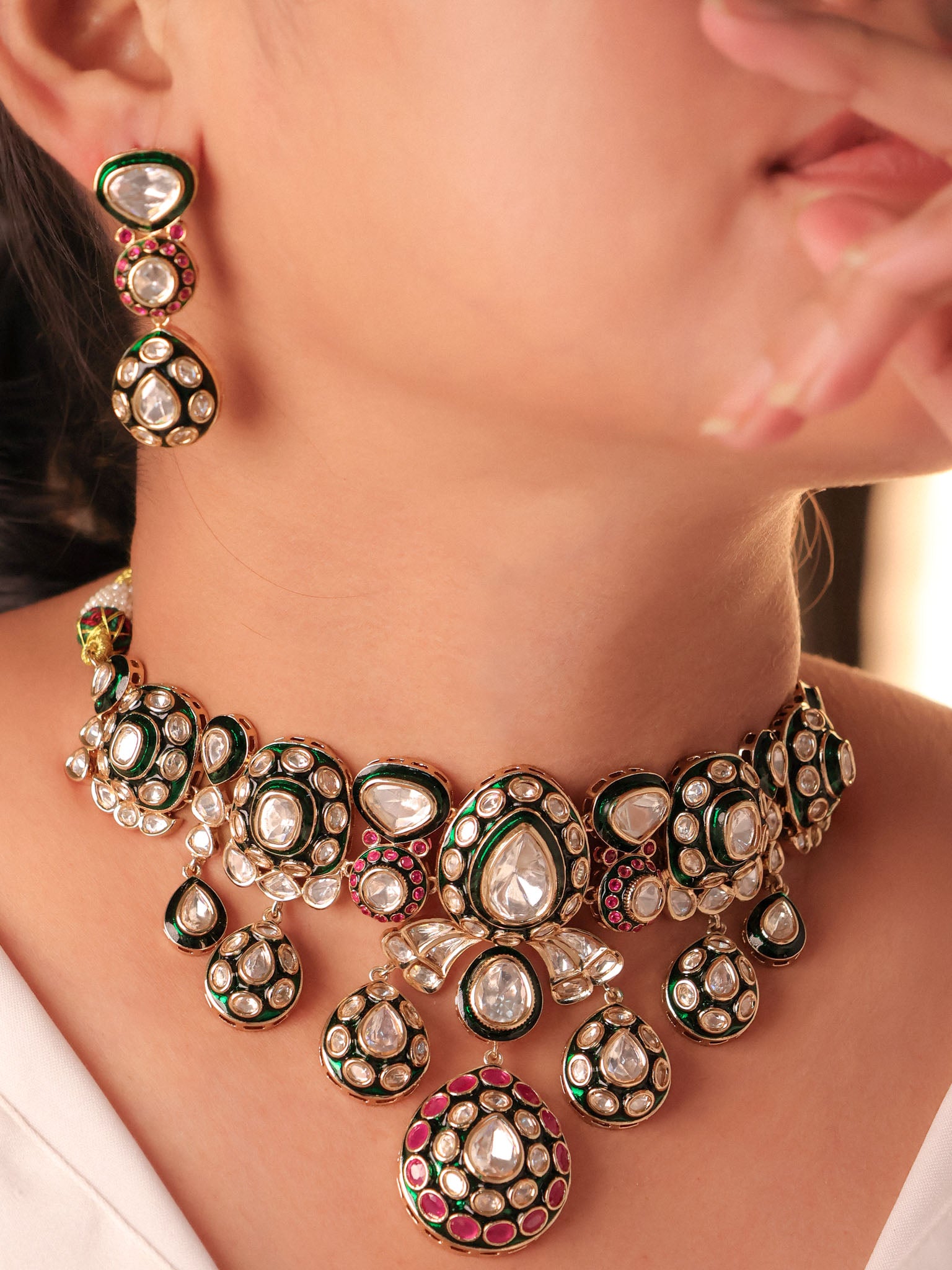 Grand kundan-look choker with emerald green meenakari, ruby accents and polki-style stones, paired with matching tiered earrings. Regal, festive, and camera-ready.
