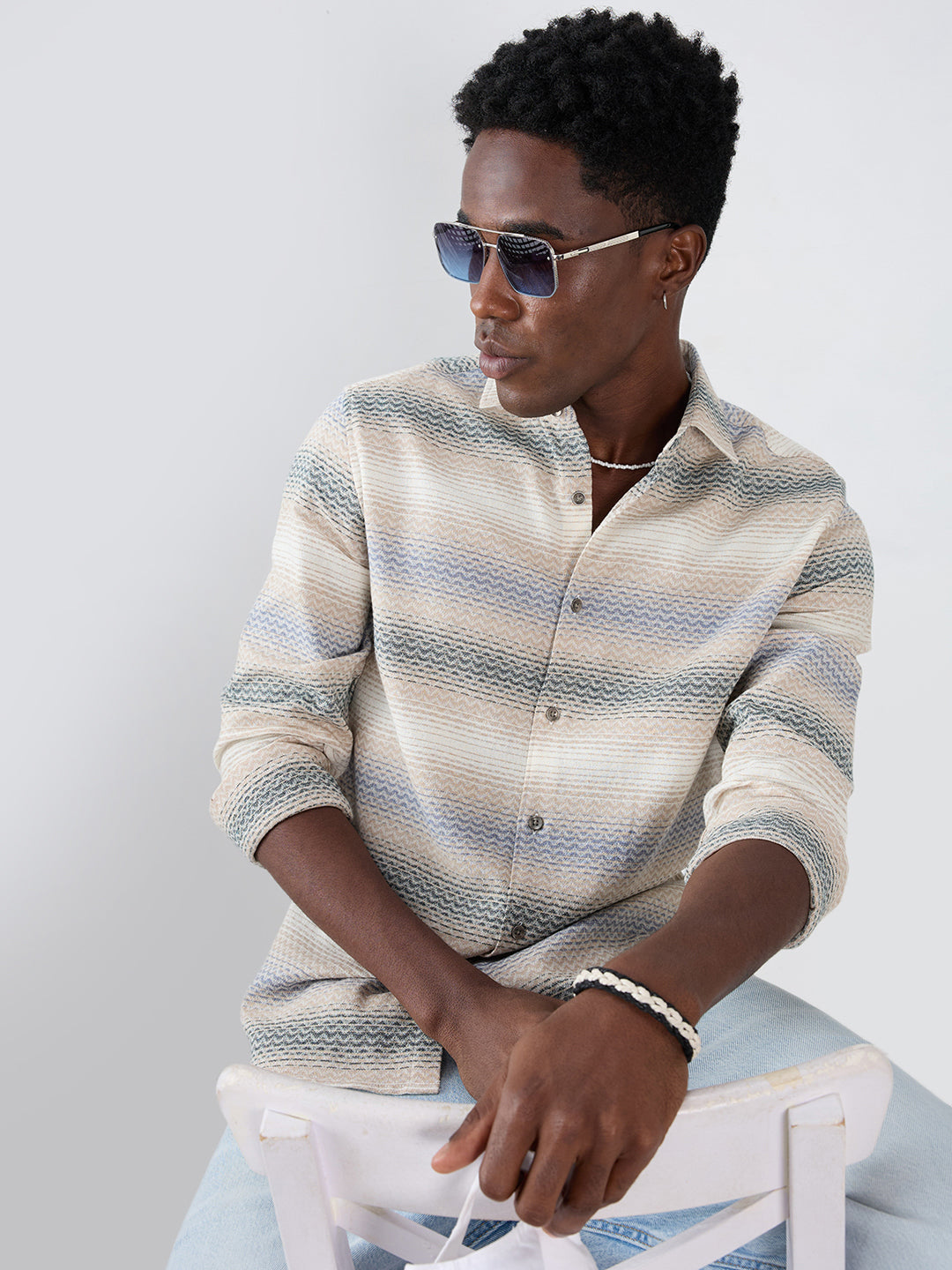 This Natural Sand Beige Contrast Motif Striped Shirt blends subtle stripes with eye-catching contrast motifs. Made from lightweight, breathable fabric, it ensures all-day comfort. A versatile piece that adds a stylish touch to casual ensembles.