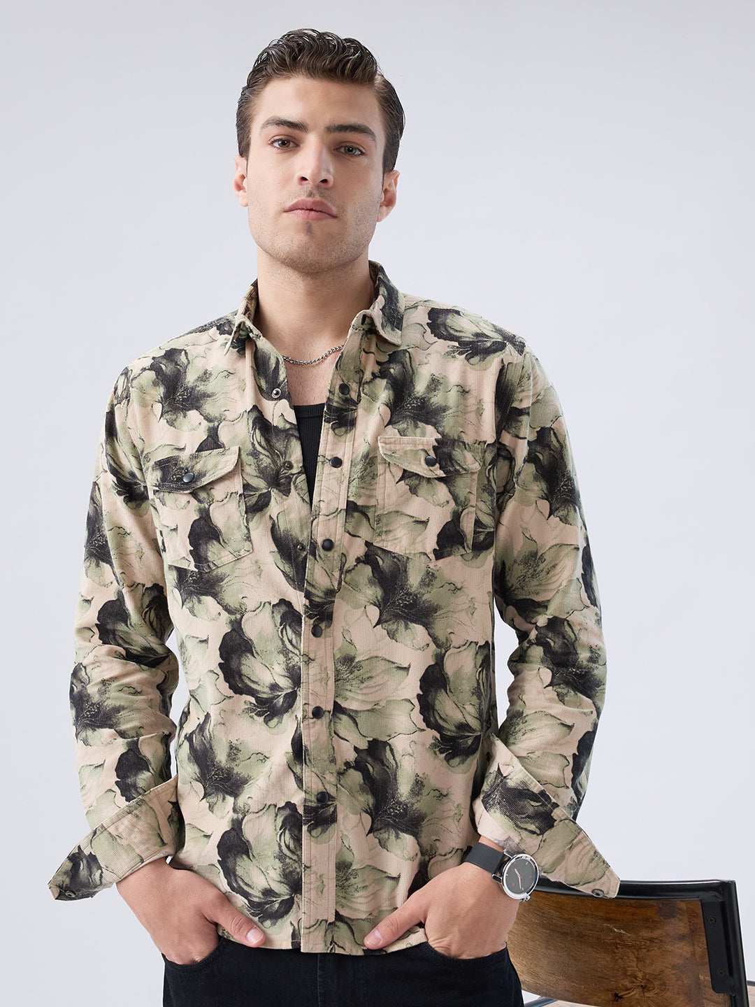 Nature Inspired Abstract Printed Double Pocket Corduroy Shirt