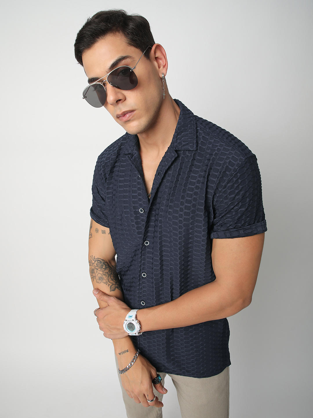 Navy Honeycomb Textured Knitted Shirt