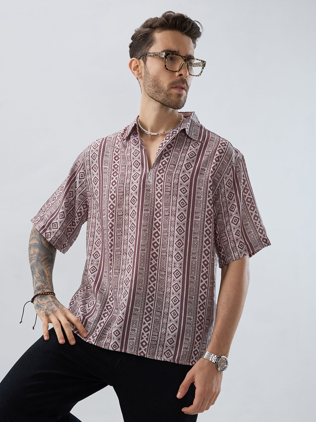 Pecan Brown Geometric Printed Oversized Polo Shirt