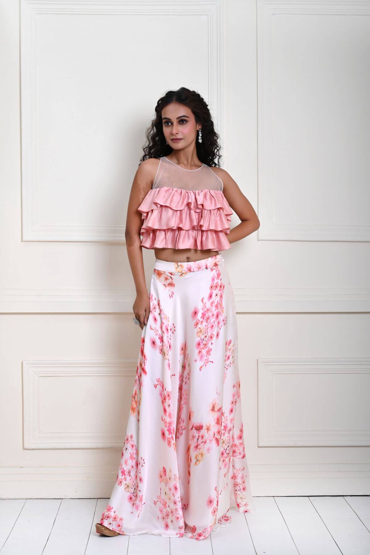 Shop the look! A stunning Pink Ruffle Top paired with an elegant off-white printed skirt in satin organza. Perfect for brunches, parties, or special events. Get yours now!