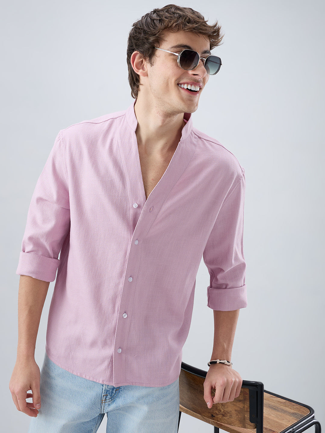 Elevate your everyday wardrobe with this Powder Blush Pink Minimal Twill Textured Stand Collar Oversized Shirt, crafted in a soft twill texture for a refined feel.The stand collar and oversized silhouette add a modern, relaxed edge. Style it with tailored our trousers for an effortlessly chic look.