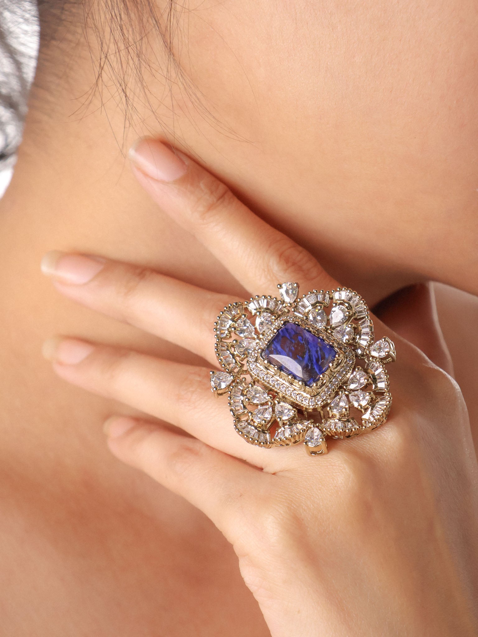 Bold and regal, this designed to make a statement. Featuring a striking centerpiece surrounded by intricate sparkling details, this ring captures the essence of vintage royal jewellery. Its ornate craftsmanship and luxurious finish make it the perfect accessory for weddings, festive occasions, and glamorous evening looks.