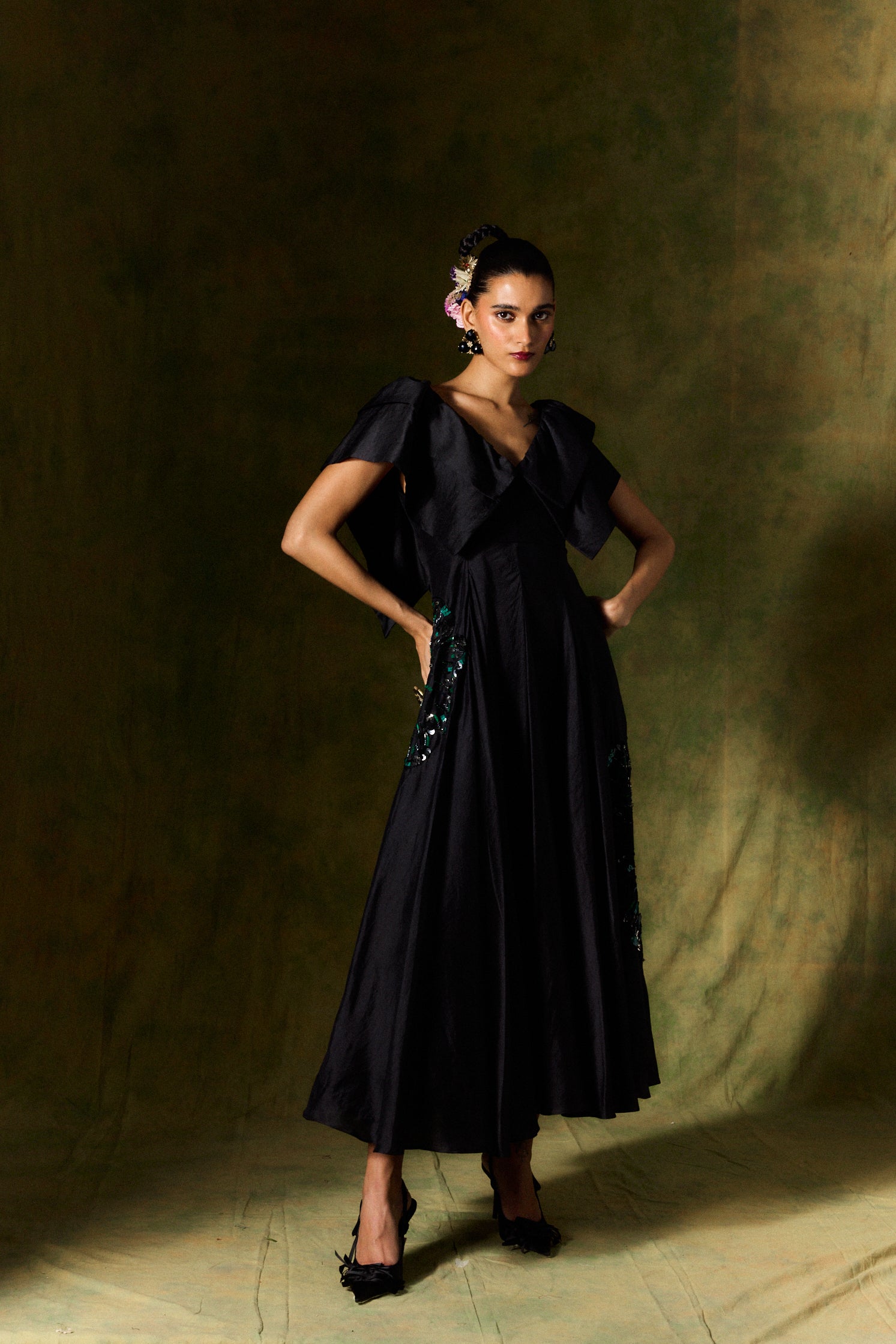 Our take on a classic black dress comes with big ruffles and even bigger volume, making this dress a head-turner! Crafted in taffeta silk, it features a pleated bodice with a flared skirt silhouette which is intricately hand embroidered with oversized floral motifs. Details are minimal but intentional, like the thin ties with beaded tassels on the open back.