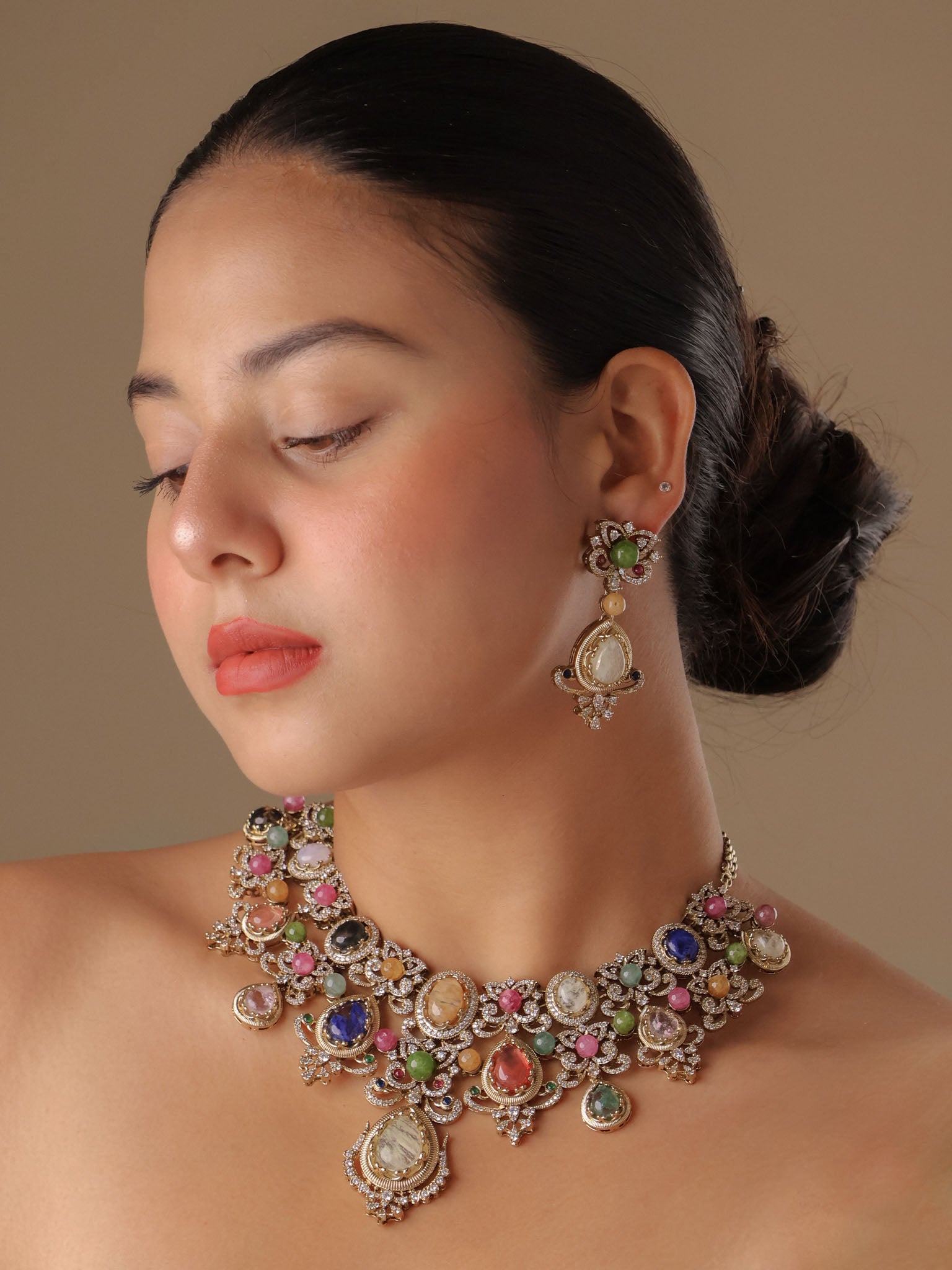 A timeless expression of old-world grandeur, this?Sabya-inspired Navratna Kundan? Set is crafted for those who love jewellery with soul and story. Featuring a rich medley of hand-set kundan stones in jewel and pastel hues, the choker is meticulously framed in a regal gold-toned finish that evokes vintage royal ateliers.