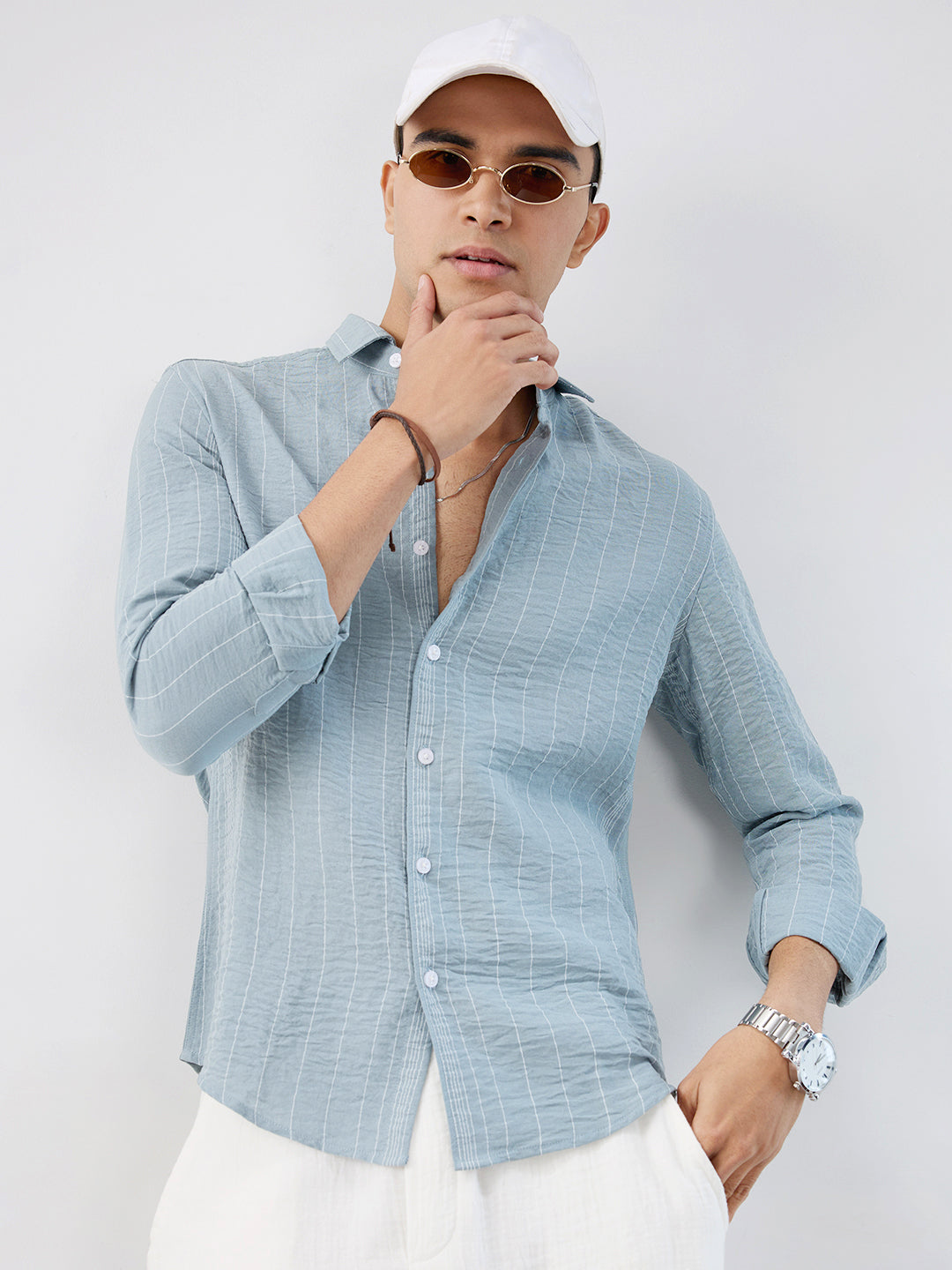 Understated and distinctive, this Schmick Dusty Teal Pinstripe Shirt pairs a soft teal hue with subtle pinstripes for a clean, polished finish. Its timeless design makes it an easy choice for refined office looks or relaxed evening outings.