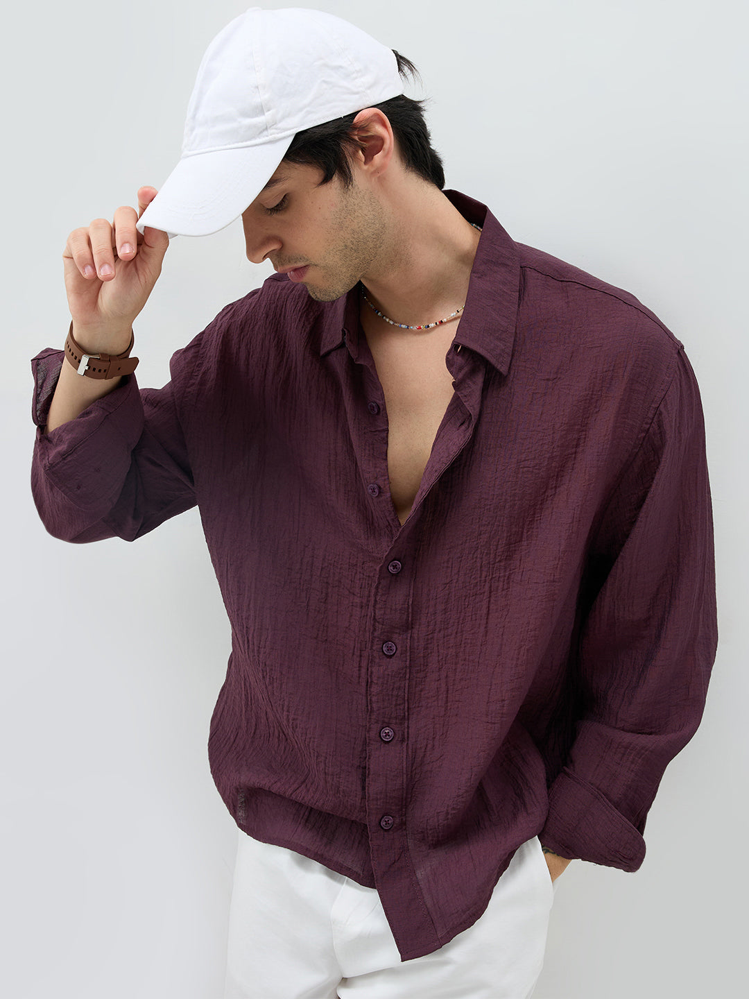 Keep your look easy and stylish with this Solid Wine Sheer Crepe Boxy Fit Crop Shirt. The airy fabric and relaxed boxy cut ensure all-day comfort, while the rich wine hue adds a subtle pop of color. Pair with jeans or our trousers, for effortless everyday elegance.