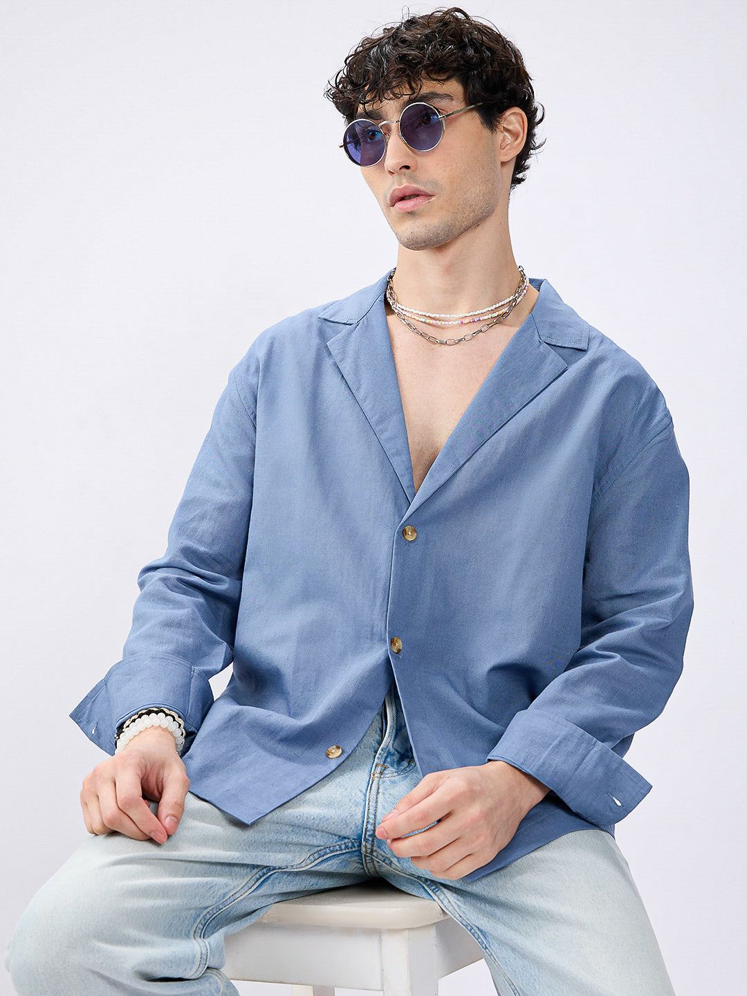 Steel Blue Linen Blend Lapel Collar Oversized Shirt