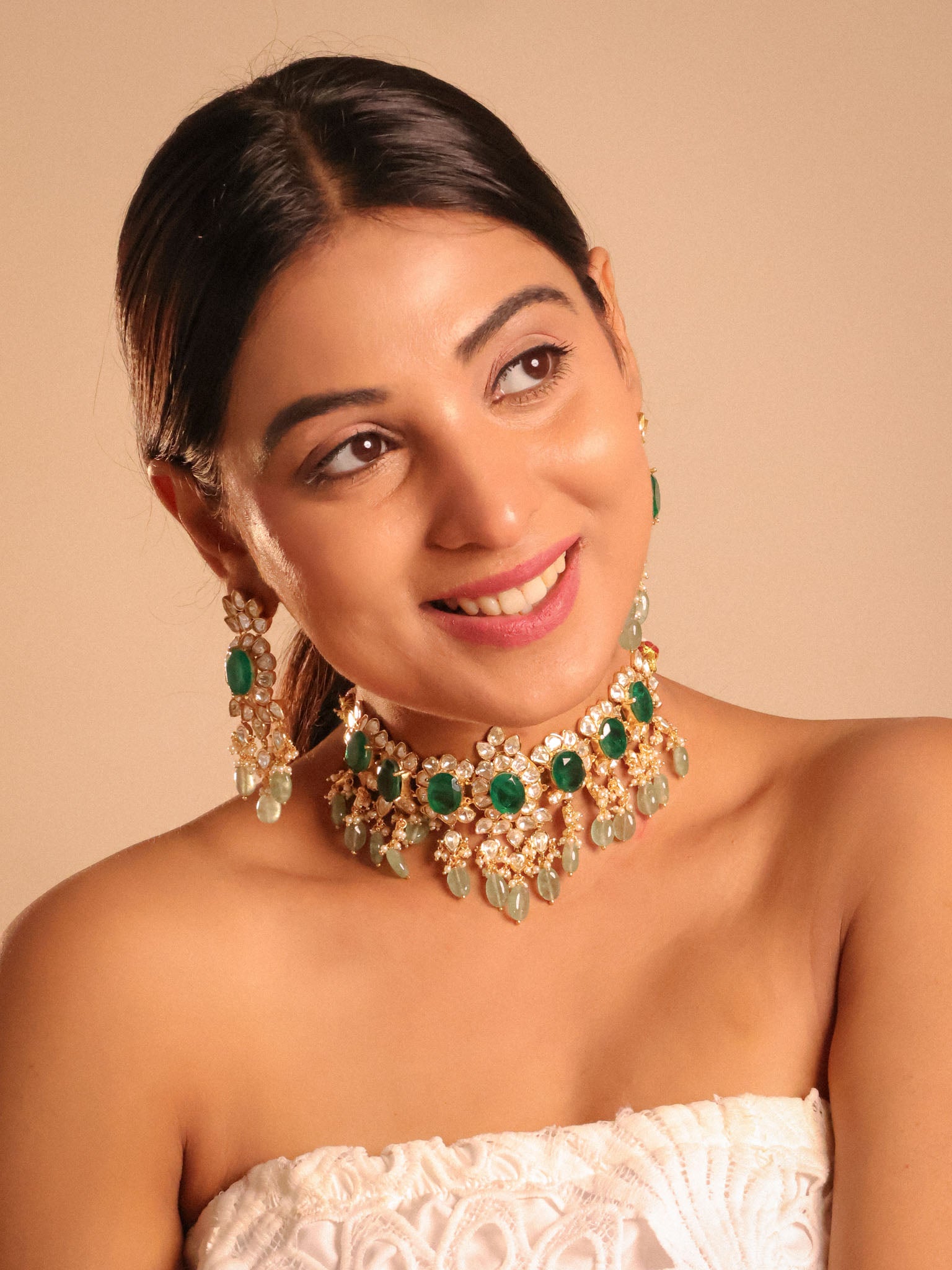 Introducing a regal statement choker fit for royalty! Emerald Green Doublet Set is encrusted with dazzling moissanite stones?and highlighted with lush mint green stones. Accompanied by drop-down earrings, it’s a modern twist on an elegant classic.