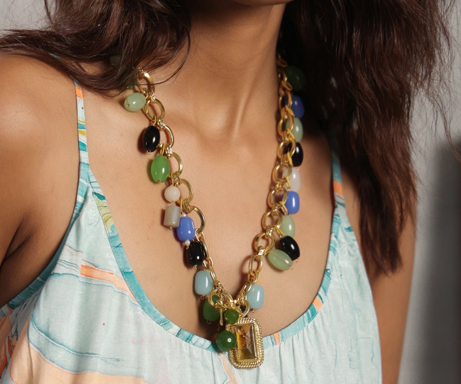The Zariah Gemstone Statement Necklace features chunky gold links adorned with an eclectic mix of handpicked multicolor stones?bringing together earthy greens, rich blacks, and serene blues. Finished with a faceted statement pendant, this necklace is the perfect balance of contemporary charm and artisanal craft.