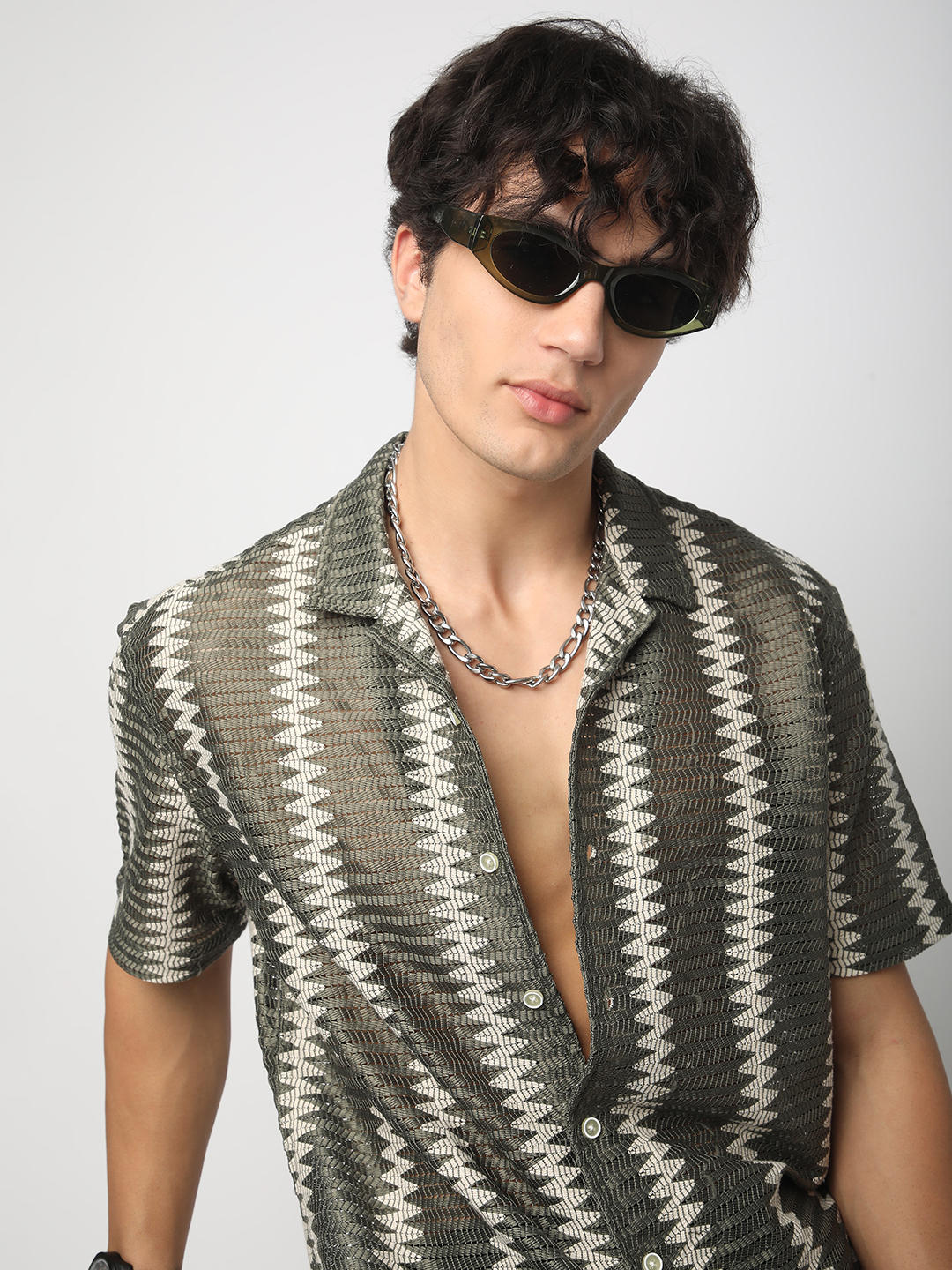 Zig-Zag Olive Crochet Oversized Shirt