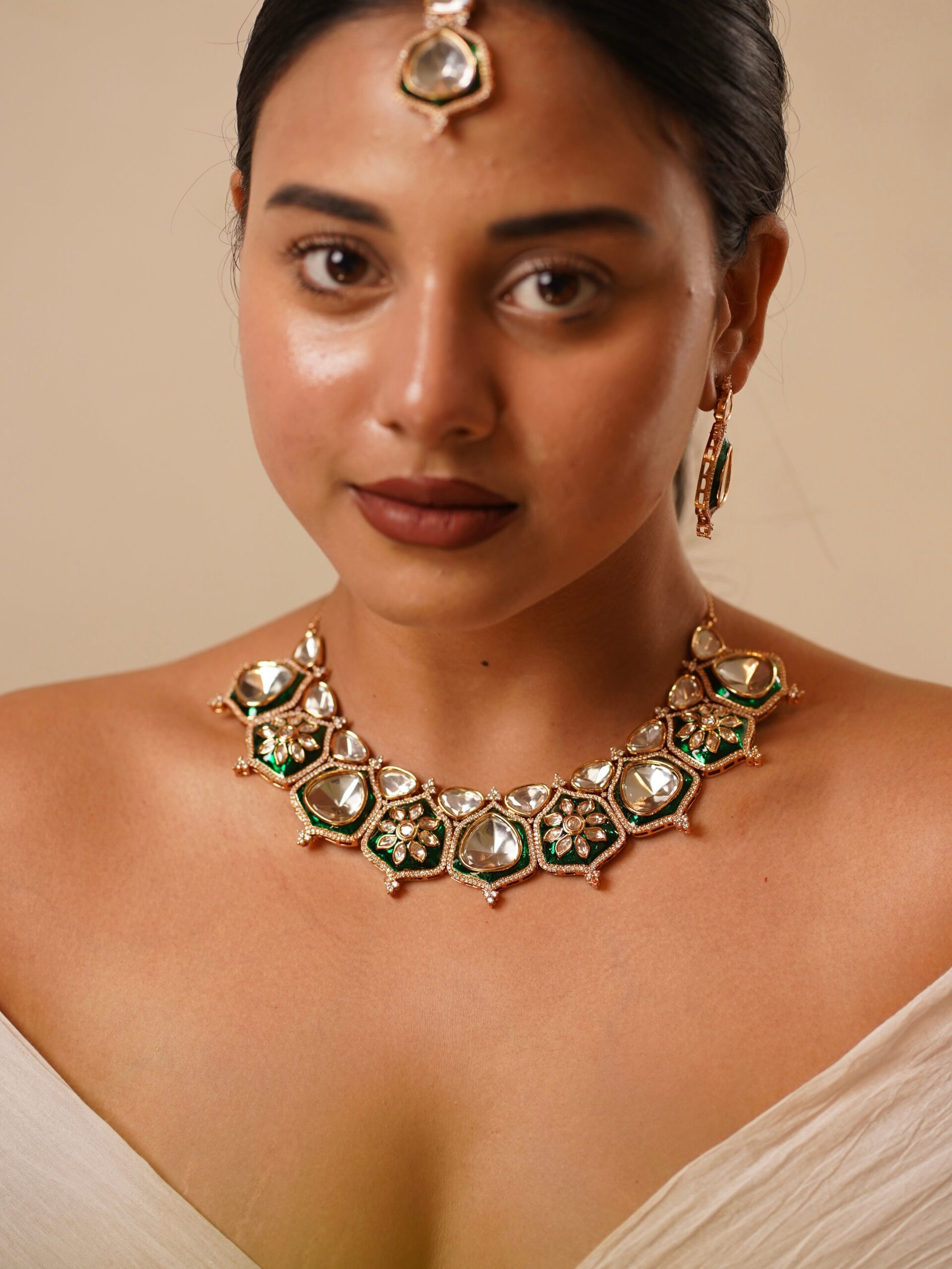 Experience elegance with the Verdant Splendor Polki Necklace Set. Adorned with striking green enamel and intricate Polki stones, this set enhances your charm for festive and wedding occasions, blending traditional artistry with modern flair.